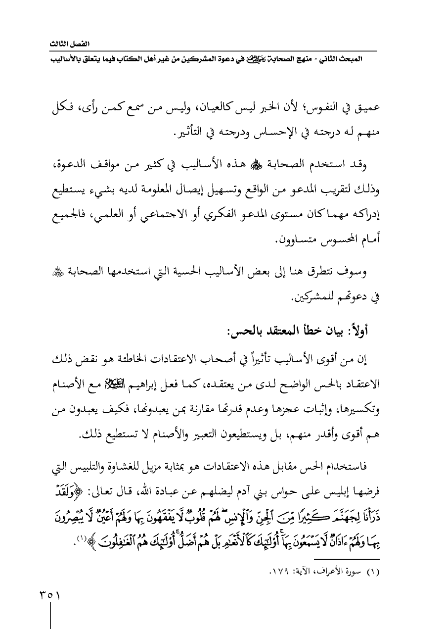 وسوف نتطرق هنا إلى بعض الأساليب الحسية التي استخدمها الصحابة - رضي الله عنهم - في دعوتهم للمشركين.