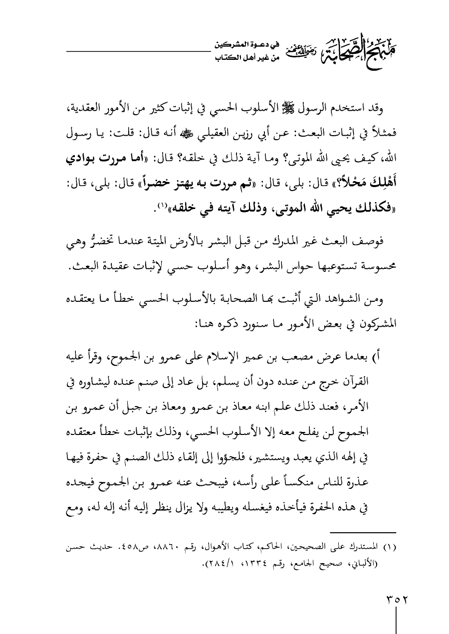 وقد استخدم الرسول - صلى الله عليه وسلم - الأسلوب الحسي في إثبات كثير من الأمور العقدية، فمثلاً في إثبات البعث: عن أبي رزين العقيلي - رضي الله عنه - أنه قال: قلت: يا رسول الله، كيف يحيى الله الموتى؟ وما آية ذلك في خلقه؟ قال: (أما مررت بوادي أَهْلِكَ مَحْلاً؟ (قال: بلى، قال: (ثم مررت به يهتز خضراً (قال: بلى، قال: (فكذلك يحيي الله الموتى، وذلك آيته في خلقه ((¬١).