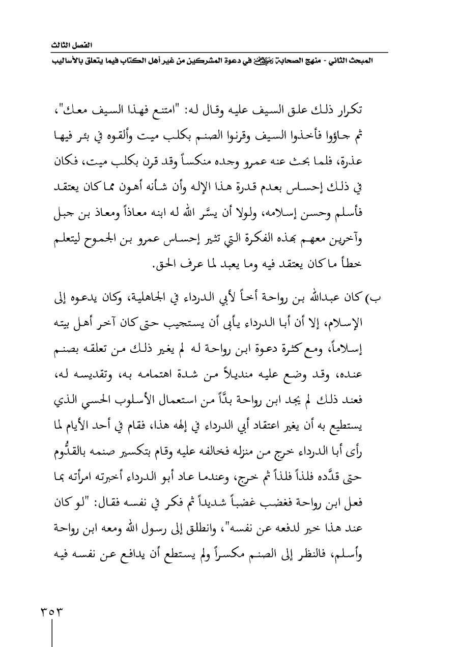 تكرار ذلك علق السيف عليه وقال له: "امتنع فهذا السيف معك"، ثم جاؤوا فأخذوا السيف وقرنوا الصنم بكلب ميت وألقوه في بئر فيها عذرة، فلما بحث عنه عمرو وجده منكساً وقد قرن بكلب ميت، فكان في ذلك إحساس بعدم قدرة هذا الإله وأن شأنه أهون مما كان يعتقد فأسلم وحسن إسلامه، ولولا أن يسَّر الله له ابنه معاذاً ومعاذ بن جبل وآخرين معهم بهذه الفكرة التي تثير إحساس عمرو بن الجموح ليتعلم خطأ ما كان يعتقد فيه وما يعبد لما عرف الحق.