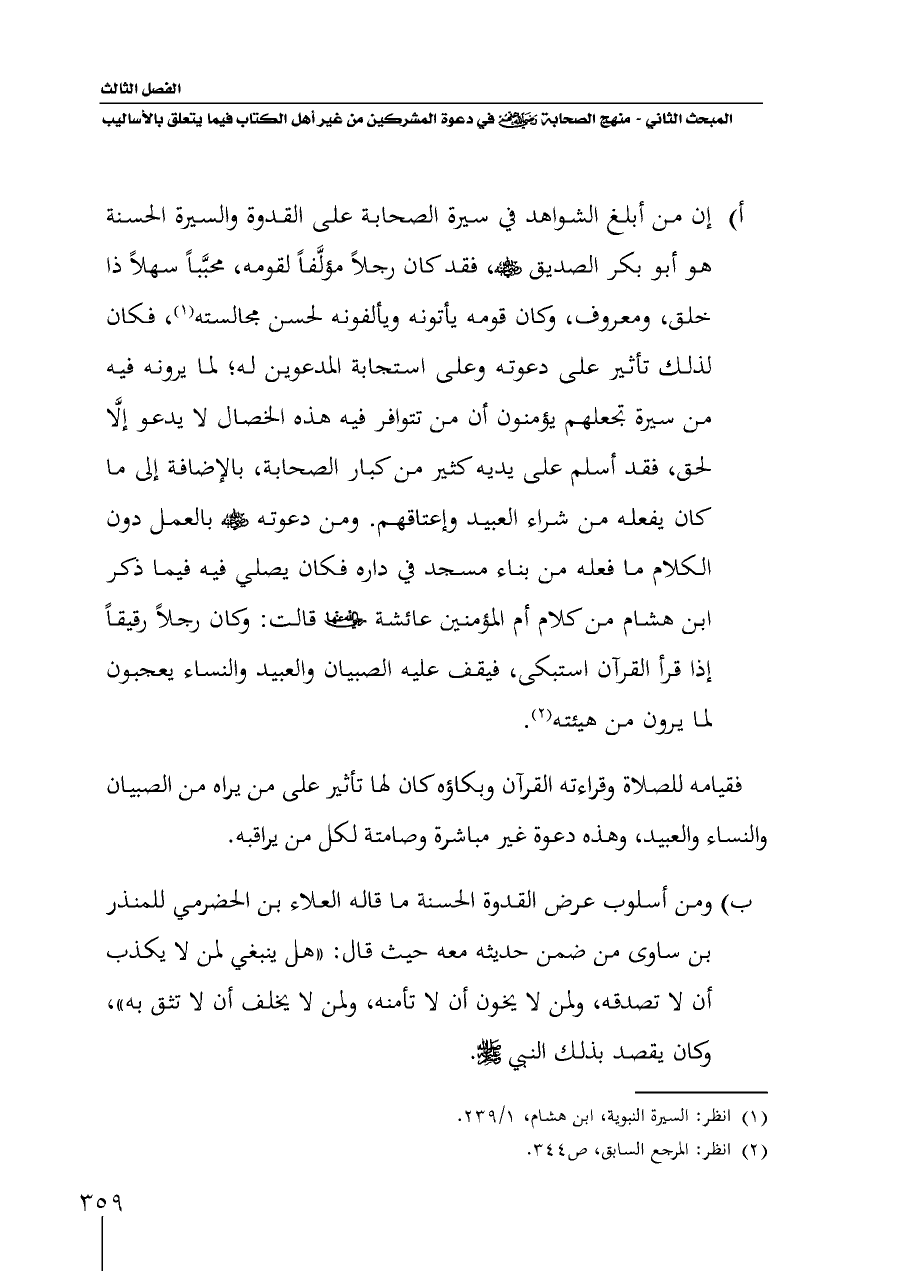 أ) إن من أبلغ الشواهد في سيرة الصحابة على القدوة والسيرة الحسنة هو أبو بكر الصديق - رضي الله عنه -، فقد كان رجلاً مؤلَّفاً لقومه، محبَّباً سهلاً ذا خلق، ومعروف، وكان قومه يأتونه ويألفونه لحسن مجالسته (¬١)، فكان لذلك تأثير على دعوته وعلى استجابة المدعوين له؛ لما يرونه فيه من سيرة تجعلهم يؤمنون أن من تتوافر فيه هذه الخصال لا يدعو إلَّا لحق، فقد أسلم على يديه كثير من كبار الصحابة، بالإضافة إلى ما كان يفعله من شراء العبيد وإعتاقهم. ومن دعوته - رضي الله عنه - بالعمل دون الكلام ما فعله من بناء مسجد في داره فكان يصلي فيه فيما ذكر ابن هشام من كلام أم المؤمنين عائشة - رضي الله عنها - قالت: وكان رجلاً رقيقاً إذا قرأ القرآن استبكى، فيقف عليه الصبيان والعبيد والنساء يعجبون لما يرون من هيئته (¬٢).