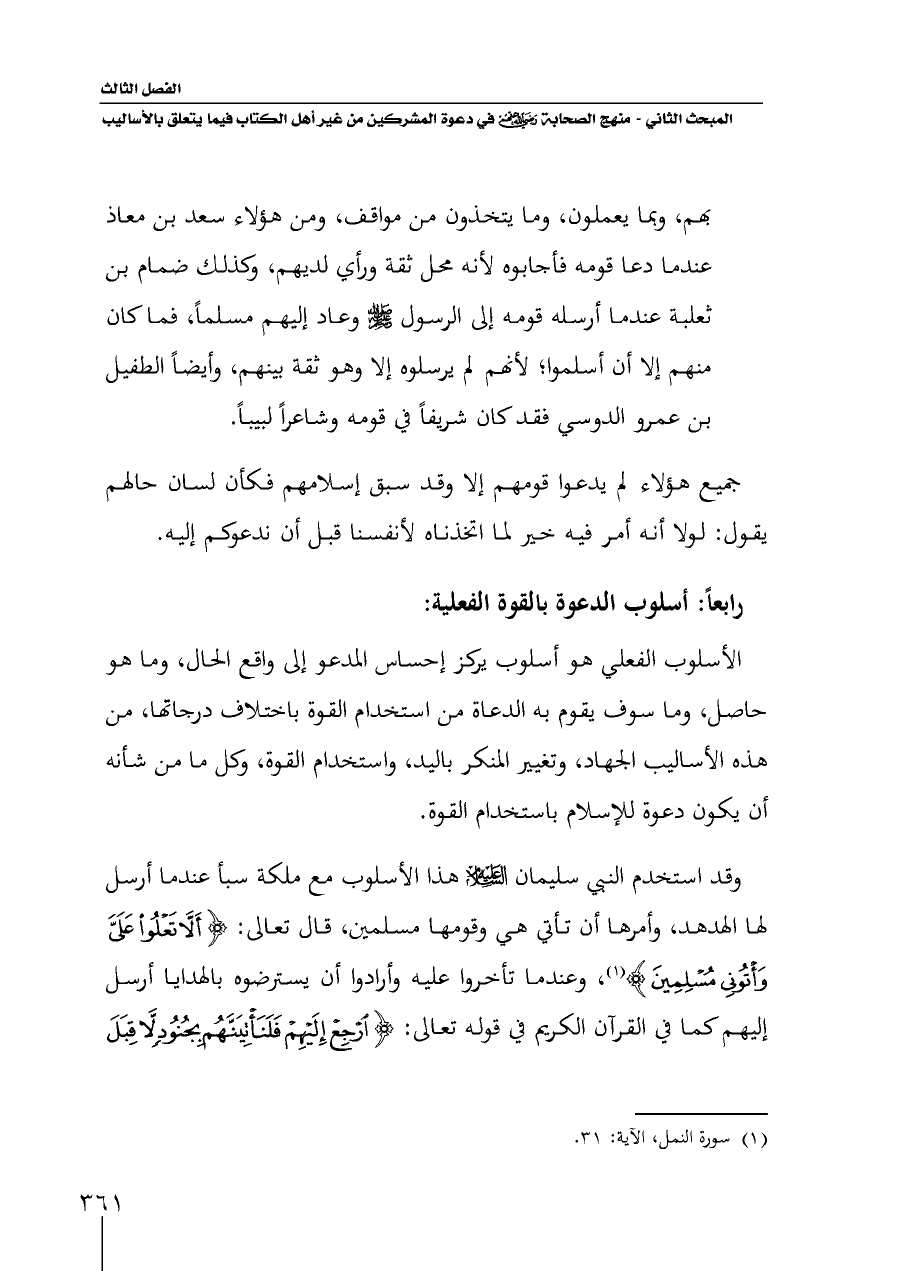 وقد استخدم النبي سليمان - عليه السلام - هذا الأسلوب مع ملكة سبأ عندما أرسل لها الهدهد، وأمرها أن تأتي هي وقومها مسلمين، قال تعالى: {أَلَّا تَعْلُوا عَلَيَّ وَأْتُونِي مُسْلِمِينَ} (¬١)، وعندما تأخروا عليه وأرادوا أن يسترضوه بالهدايا أرسل إليهم كما في القرآن الكريم في قوله تعالى: {ارْجِعْ إِلَيْهِمْ فَلَنَأْتِيَنَّهُمْ بِجُنُودٍ لَا قِبَلَ