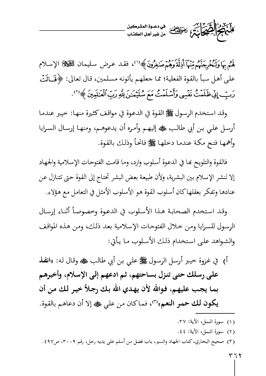 أ) في غزوة خيبر أرسل الرسول - صلى الله عليه وسلم - علي بن أبي طالب - رضي الله عنه - وقال له: (انفذ على رسلك حتى تنزل بساحتهم، ثم ادعهم إلى الإسلام، وأخبرهم بما يجب عليهم، فوالله لأن يهدي الله بك رجلاً خير لك من أن يكون لك حمر النعم ((¬٣)، فما كان من علي - رضي الله عنه - إلا أن دعاهم بالقوة.