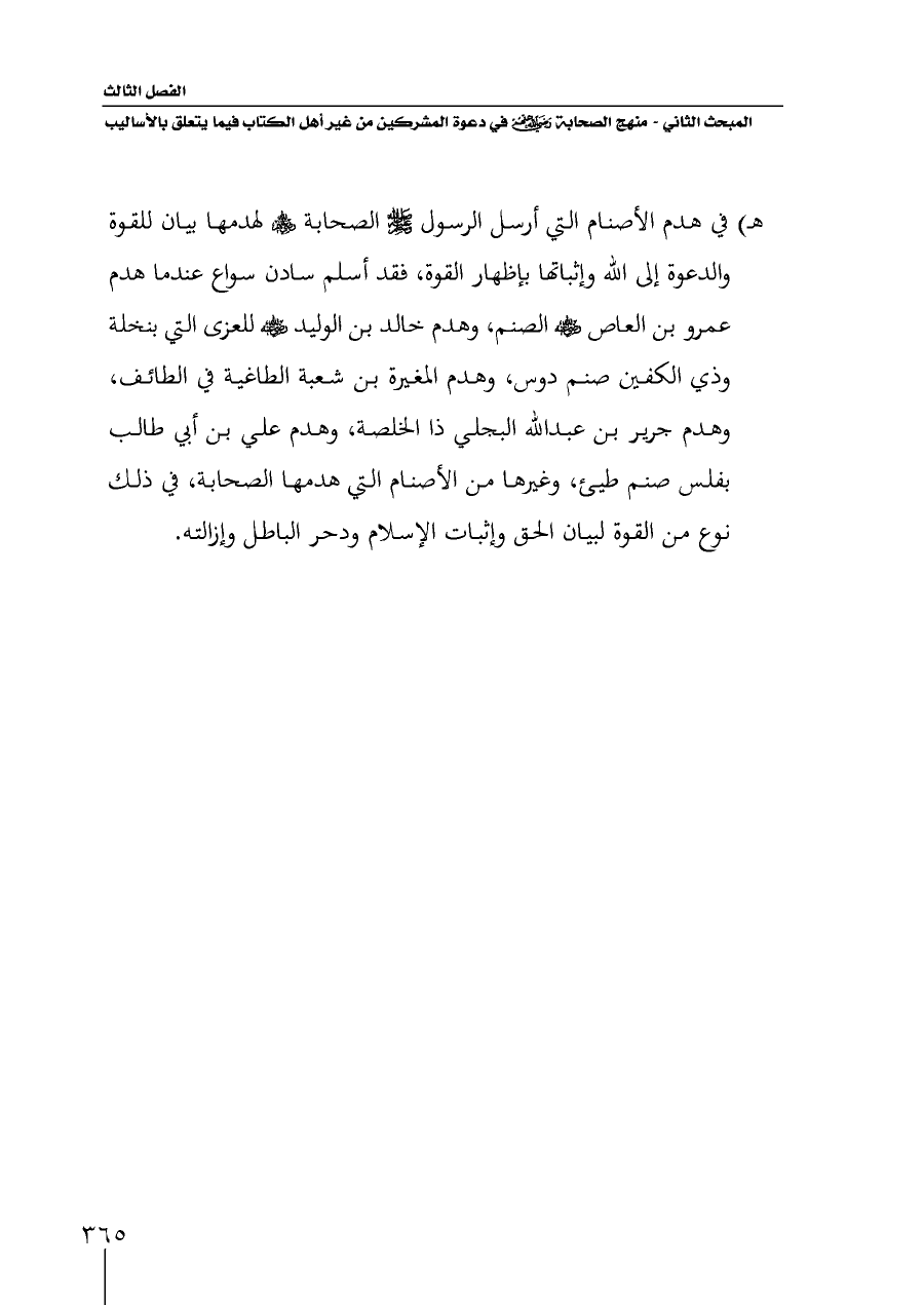 هـ) في هدم الأصنام والتي أرسل الرسول - صلى الله عليه وسلم - الصحابة - رضي الله عنهم - لهدمها بيان للقوة والدعوة إلى الله وإثباتها بإظهار القوة، فقد أسلم سادن سواع عندما هدم عمرو بن العاص - رضي الله عنه - الصنم، وهدم خالد بن الوليد - رضي الله عنه - للعزى التي بنخلة وذي الكفين صنم دوس، وهدم المغيرة بن شعبة الطاغية في الطائف، وهدم جرير بن عبدالله البجلي ذي الخلصة، وهدم علي بن أبي طالب بفلس صنم طيئ، وغيرها من الأصنام التي هدمها الصحابة، في ذلك نوع من القوة لبيان الحق وإثبات الإسلام ودحر الباطل وإزالته.