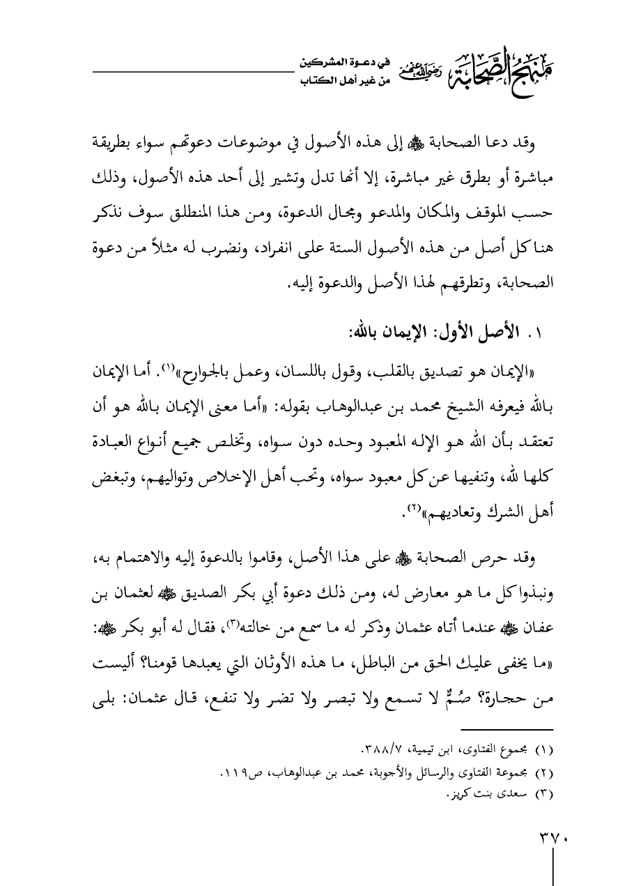 وقد حرص الصحابة - رضي الله عنهم - على هذا الأصل، وقاموا بالدعوة إليه والاهتمام به، ونبذوا كل ما هو معارض له، ومن ذلك دعوة أبي بكر الصديق - رضي الله عنه - لعثمان بن عفان - رضي الله عنه - عندما أتاه عثمان وذكر له ما سمع من خالته (¬٣)، فقال له أبو بكر - رضي الله عنه -: "ما يخفى عليك الحق من الباطل، ما هذه الأوثان التي يعبدها قومنا؟ أليست من حجارة؟ صُمٌّ لا تسمع ولا تبصر ولا تضر ولا تنفع، قال عثمان: بلى