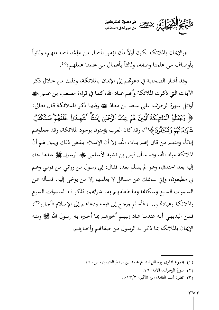وقد أشار الصحابة في دعوتهم إلى الإيمان بالملائكة، وذلك من خلال ذكر الآيات التي ذكرت الملائكة وأنهم عباد الله، كما في قراءة مصعب بن عمير - رضي الله عنه - أوائل سورة الزخرف على سعد بن معاذ - رضي الله عنه - وفيها ذكر للملائكة قال تعالى: {وَجَعَلُوا الْمَلَائِكَةَ الَّذِينَ هُمْ عِبَادُ الرَّحْمَنِ إِنَاثًا أَشَهِدُوا خَلْقَهُمْ سَتُكْتَبُ شَهَادَتُهُمْ وَيُسْأَلُونَ} (¬٢)، وقد كان العرب يؤمنون بوجود الملائكة، وقد جعلوهم إناثاً، ومنهم من قال إنهم بنات الله، إلا أن الإسلام ينقض ذلك ويبين لهم أنّ الملائكة عباد الله، وقد سأل قيس بن نشبة الأسلمي - رضي الله عنه - الرسول - صلى الله عليه وسلم - عندما جاء إليه بعد الخندق، وهو لم يسلم بعد، فقال: إني رسول من ورائي من قومي وهم لي مطيعون، وإني سائلك عن مسائل لا يعلمها إلا من يوحَى إليه، فسأله عن السموات السبع وسكانها وما طعامهم وما شرابهم، فذكر له السموات السبع والملائكة وعبادتهم ... ، فأسلم ورجع إلى قومه ودعاهم إلى الإسلام فأجابوا (¬٣)، فمن البديهي أنه عندما عاد إليهم أخبرهم بما أخبره به رسول الله - صلى الله عليه وسلم - ومنه الإيمان بالملائكة بما ذكر له الرسول من صفاتهم وأخبارهم.