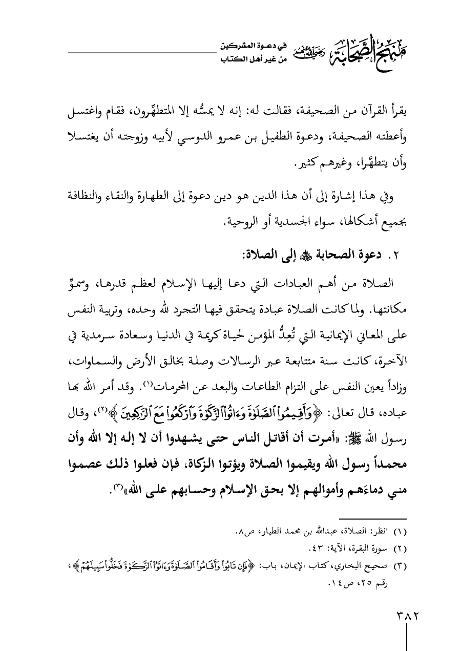 يقرأ القرآن من الصحيفة، فقالت له: إنه لا يمسُّه إلا المتطهِّرون، فقام واغتسل وأعطته الصحيفة، ودعوة الطفيل بن عمرو الدوسي لأبيه وزوجته أن يغتسلا وأن يتطهَّرا، وغيرهم كثير.