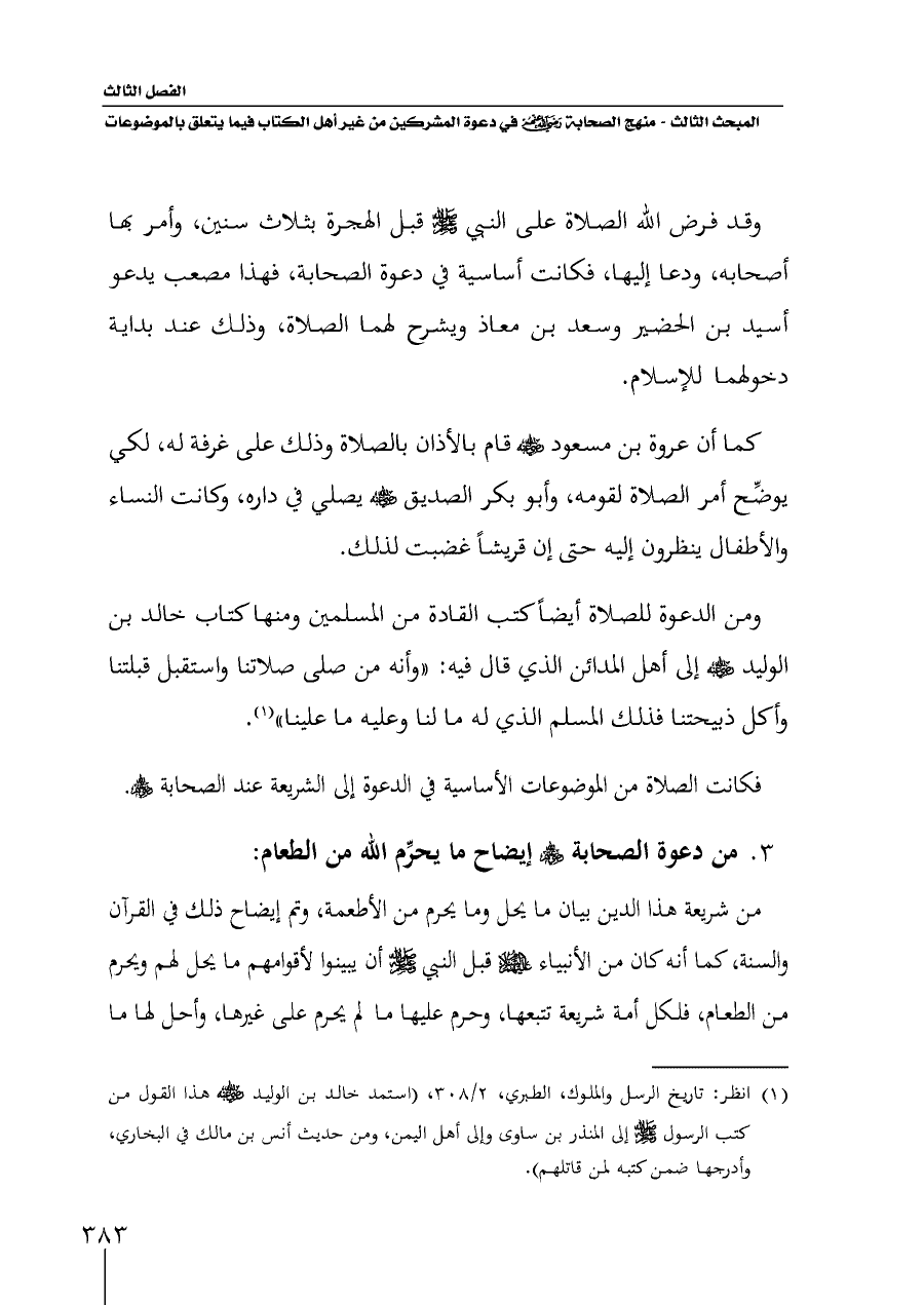 ومن الدعوة للصلاة أيضاً كتب القادة من المسلمين ومنها كتاب خالد بن الوليد - رضي الله عنه - إلى أهل المدائن الذي قال فيه: "وأنه من صلى صلاتنا واستقبل قبلتنا وأكل ذبيحتنا فذلك المسلم الذي له ما لنا وعليه ما علينا" (¬١).