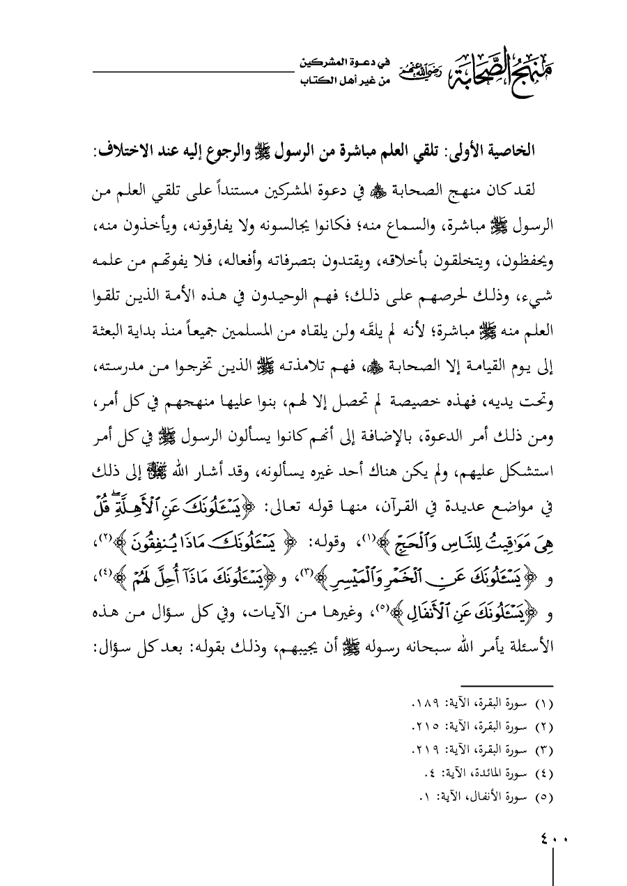 لقد كان منهج الصحابة - رضي الله عنهم - في دعوة المشركين مستنداً على تلقي العلم من الرسول - صلى الله عليه وسلم - مباشرة، والسماع منه؛ فكانوا يجالسونه ولا يفارقونه، ويأخذون منه، ويحفظون، ويتخلقون بأخلاقه، ويقتدون بتصرفاته وأفعاله، فلا يفوتهم من علمه شيء، وذلك لحرصهم على ذلك؛ فهم الوحيدون في هذه الأمة الذين تلقوا العلم منه - صلى الله عليه وسلم - مباشرة؛ لأنه لم يلقَه ولن يلقاه من المسلمين جميعاً منذ بداية البعثة إلى يوم القيامة إلا الصحابة - رضي الله عنهم -، فهم تلامذته - صلى الله عليه وسلم - الذين تخرجوا من مدرسته، وتحت يديه، فهذه خصيصة لم تحصل إلا لهم، بنوا عليها منهجهم في كل أمر، ومن ذلك أمر الدعوة، بالإضافة إلى أنهم كانوا يسألون الرسول - صلى الله عليه وسلم - في كل أمر استشكل عليهم، ولم يكن هناك أحد غيره يسألونه، وقد أشار الله - سبحانه وتعالى - إلى ذلك في مواضع عديدة في القرآن، منها قوله تعالى: {يَسْأَلُونَكَ عَنِ الْأَهِلَّةِ قُلْ هِيَ مَوَاقِيتُ لِلنَّاسِ وَالْحَجِّ} (¬١)، وقوله: {يَسْأَلُونَكَ مَاذَا يُنْفِقُونَ} (¬٢)، و {يَسْأَلُونَكَ عَنِ الْخَمْرِ وَالْمَيْسِرِ} (¬٣)، و {يَسْأَلُونَكَ مَاذَا أُحِلَّ لَهُمْ} (¬٤)، و {يَسْأَلُونَكَ عَنِ الْأَنْفَالِ} (¬٥)،
