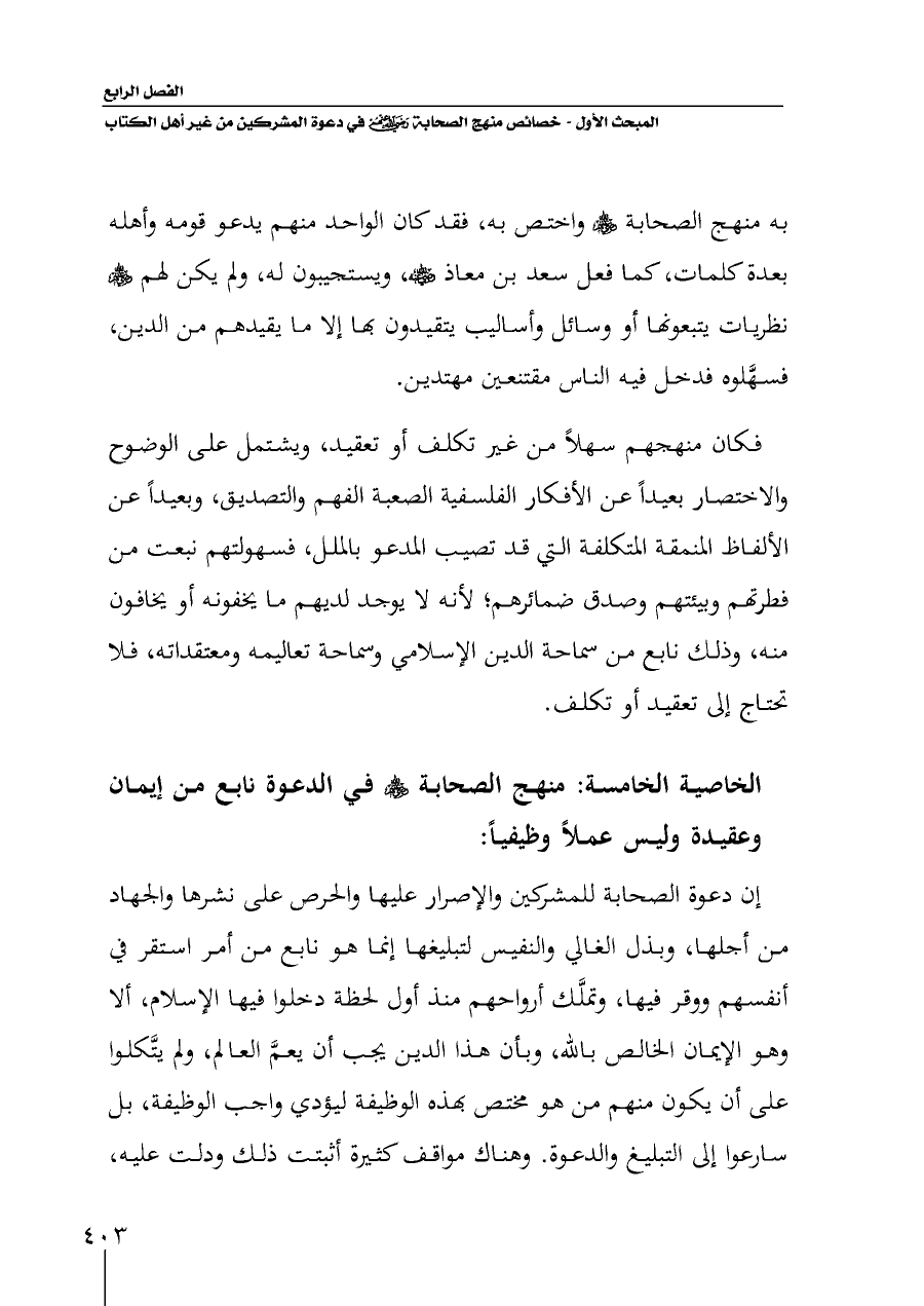 به منهج الصحابة - رضي الله عنهم - واختص به، فقد كان الواحد منهم يدعو قومه وأهله بعدة كلمات، كما فعل سعد بن معاذ - رضي الله عنه -، ويستجيبون له، ولم يكن لهم - رضي الله عنهم - نظريات يتبعونها أو وسائل وأساليب يتقيدون بها إلا ما يقيدهم من الدين، فسهَّلوه فدخل فيه الناس مقتنعين مهتدين.