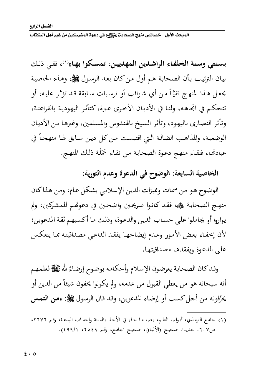بسنتي وسنة الخلفاء الراشدين المهديين، تمسكوا بها" (¬١)، ففي ذلك بيان الترتيب بأن الصحابة هم أول من كان بعد الرسول - صلى الله عليه وسلم -، وهذه الخاصية تجعل هذا المنهج نقيَّاً من أي شوائب أو ترسبات سابقة قد تؤثر عليه، أو تتحكم في اتجاهه، ولنا في الأديان الأخرى عبرة، كتأثر اليهودية بالفراعنة، وتأثر النصارى باليهود، وتأثر السيخ بالهندوس والمسلمين، وغيرها من الأديان الوضعية، والمذاهب الضالة التي اقتبست من كل دين سابق لها منهجاً في عبادتها، فنقاء منهج دعوة الصحابة من نقاء حَمَلَة ذلك المنهج.