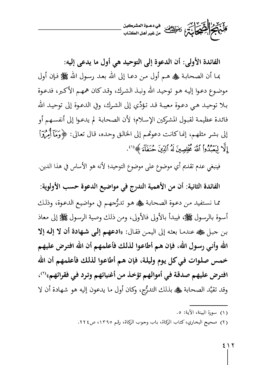 مما نستفيد من دعوة الصحابة - رضي الله عنهم - هو تدرُّجهم في مواضيع الدعوة، وذلك أسوة بالرسول - صلى الله عليه وسلم -، فيبدأ بالأولى فالأولى، ومن ذلك وصية الرسول - صلى الله عليه وسلم - إلى معاذ بن جبل - رضي الله عنه - عندما بعثه إلى اليمن فقال: "ادعهم إلى شهادة أن لا إله إلا الله وأني رسول الله، فإن هم أطاعوا لذلك فأعلمهم أن الله افترض عليهم خمس صلوات في كل يوم وليلة، فإن هم أطاعوا لذلك فأعلمهم أن الله افترض عليهم صدقة في أموالهم تؤخذ من أغنيائهم وترد في فقرائهم" (¬٢)، وقد تقيَّد الصحابة - رضي الله عنهم - بذلك التدرُّج، وكان أول ما يدعون إليه هو شهادة أن لا