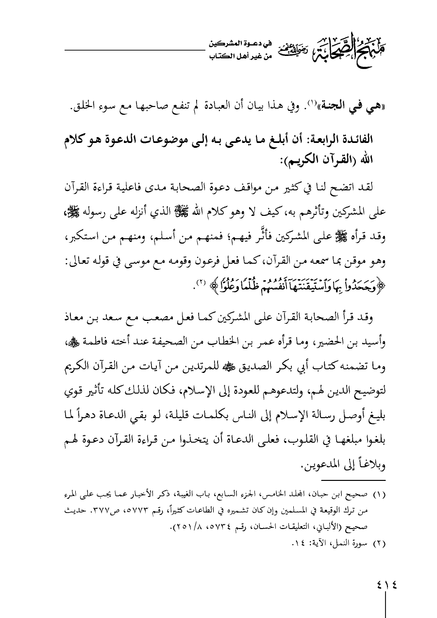 الفائدة الرابعة: أن أبلغ ما يدعى به إلى موضوعات الدعوة هو كلام الله (القرآن الكريم):