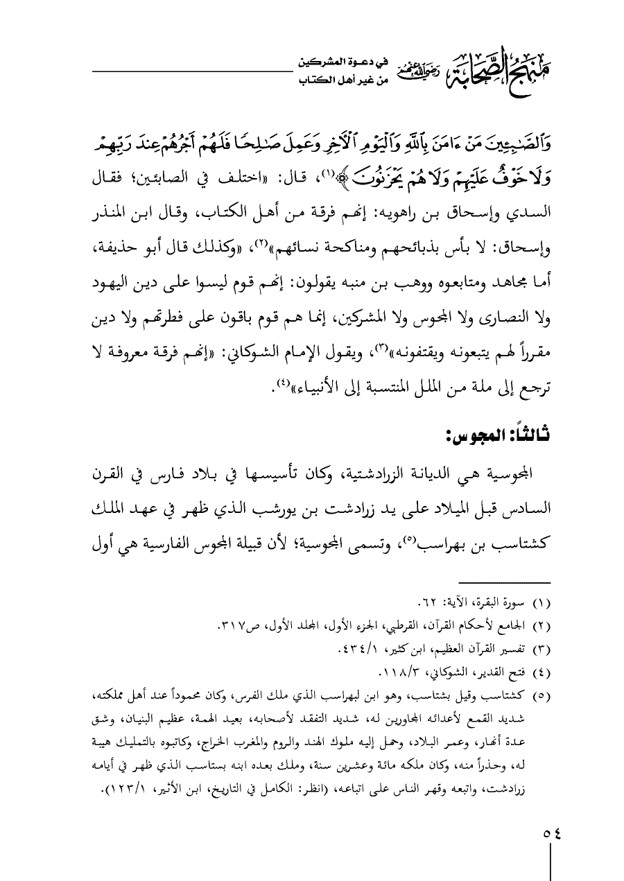 وَالصَّابِئِينَ مَنْ آمَنَ بِاللَّهِ وَالْيَوْمِ الْآخِرِ وَعَمِلَ صَالِحًا فَلَهُمْ أَجْرُهُمْ عِنْدَ رَبِّهِمْ وَلَا خَوْفٌ عَلَيْهِمْ وَلَا هُمْ يَحْزَنُونَ} (¬١)، قال: "اختلف في الصابئين؛ فقال السدي وإسحاق بن راهويه: إنهم فرقة من أهل الكتاب، وقال ابن المنذر وإسحاق: لا بأس بذبائحهم ومناكحة نسائهم" (¬٢)، "وكذلك قال أبو حذيفة، أما مجاهد ومتابعوه ووهب بن منبه يقولون: إنهم قوم ليسوا على دين اليهود ولا النصارى ولا المجوس ولا المشركين، إنما هم قوم باقون على فطرتهم ولا دين مقرراً لهم يتبعونه ويقتفونه" (¬٣)، ويقول الإمام الشوكاني: "إنهم فرقة معروفة لا ترجع إلى ملة من الملل المنتسبة إلى الأنبياء" (¬٤).
