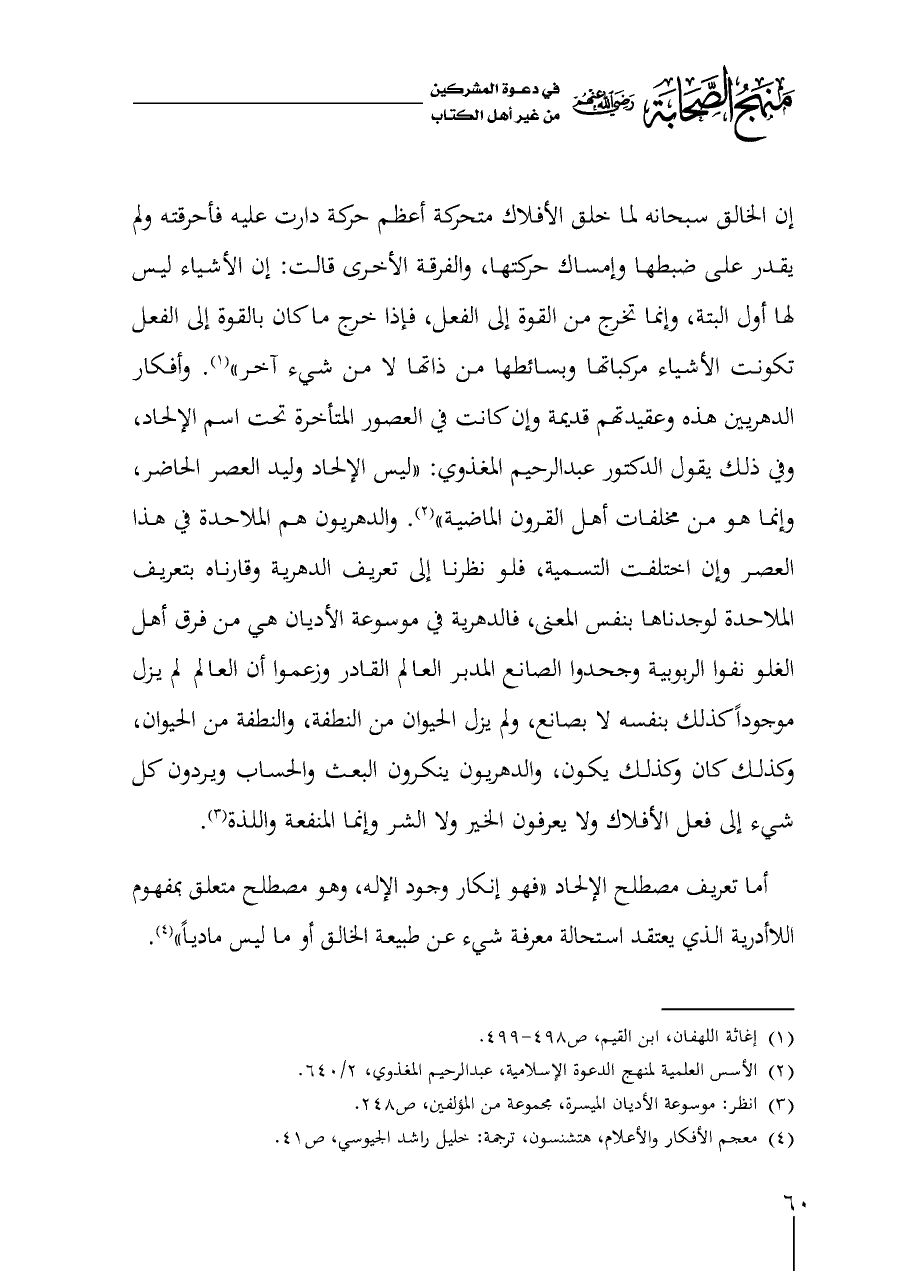 إن الخالق سبحانه لما خلق الأفلاك متحركة أعظم حركة دارت عليه فأحرقته ولم يقدر على ضبطها وإمساك حركتها، والفرقة الأخرى قالت: إن الأشياء ليس لها أول البتة، وإنما تخرج من القوة إلى الفعل، فإذا خرج ما كان بالقوة إلى الفعل تكونت الأشياء مركباتها وبسائطها من ذاتها لا من شيء آخر" (¬١). وأفكار الدهريين هذه وعقيدتهم قديمة وإن كانت في العصور المتأخرة تحت اسم الإلحاد، وفي ذلك يقول الدكتور عبدالرحيم المغذوي: "ليس الإلحاد وليد العصر الحاضر، وإنما هو من مخلفات أهل القرون الماضية" (¬٢). والدهريون هم الملاحدة في هذا العصر وإن اختلفت التسمية، فلو نظرنا إلى تعريف الدهرية وقارناه بتعريف الملاحدة لوجدناها بنفس المعنى، فالدهرية في موسوعة الأديان هي من فرق أهل الغلو نفوا الربوبية وجحدوا الصانع المدبر العالم القادر وزعموا أن العالم لم يزل موجوداً كذلك بنفسه لا بصانع، ولم يزل الحيوان من النطفة، والنطفة من الحيوان، وكذلك كان وكذلك يكون، والدهريون ينكرون البعث والحساب ويردون كل شيء إلى فعل الأفلاك ولا يعرفون الخير ولا الشر وإنما المنفعة واللذة (¬٣).