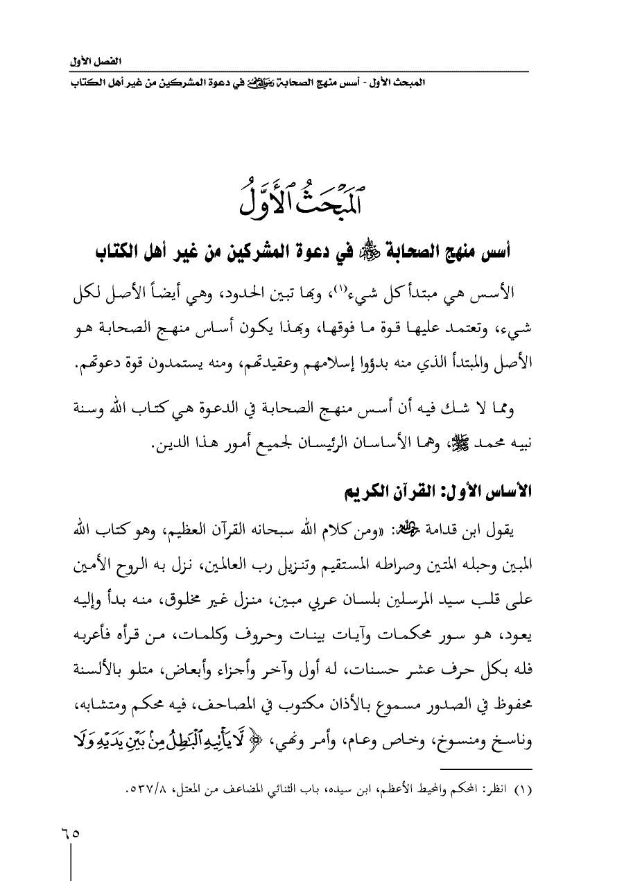 الأسس هي مبتدأ كل شيء (¬١)، وبها تبين الحدود، وهي أيضاً الأصل لكل شيء، وتعتمد عليها قوة ما فوقه، وبهذا يكون أساس منهج الصحابة هو الأصل والمبتدأ الذي منه بدؤوا إسلامهم وعقيدتهم، ومنه يستمدون قوة دعوتهم.