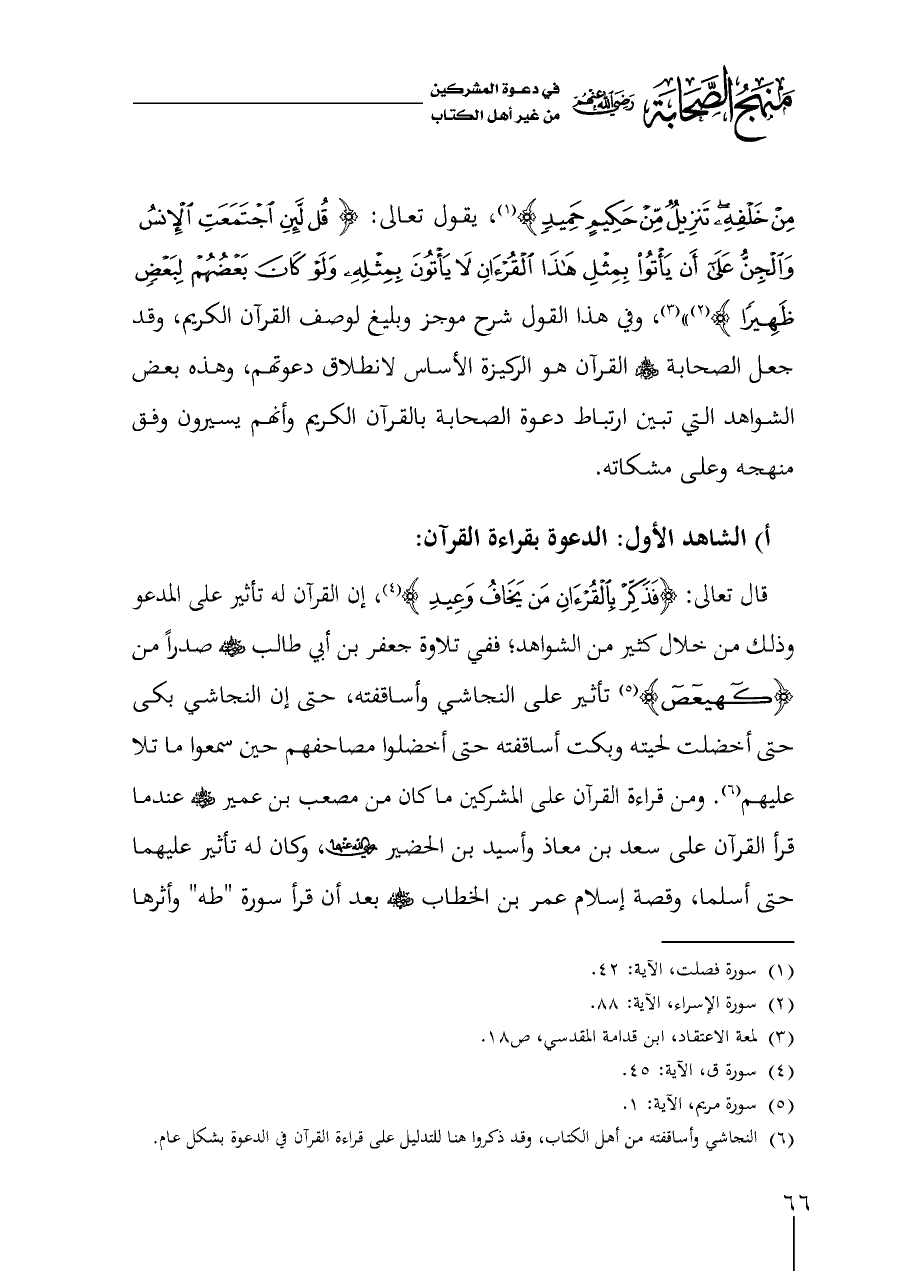 (¬٦) النجاشي وأساقفته من أهل الكتاب، وقد ذكروا هنا للتدليل على قراءة القرآن في الدعوة بشكل عام.