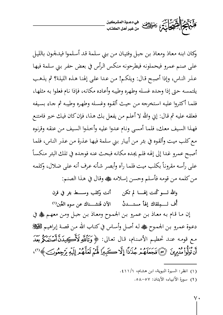 وكان ابنه معاذ ومعاذ بن جبل وفتيان من بني سلمة قد أسلموا فيدلجون بالليل على صنم عمرو فيحملونه فيطرحونه منكس الرأس في بعض حفر بني سلمة فيها عذر الناس، وإذا أصبح قال: ويلكم! من عدا على إلهنا هذه الليلة؟ ثم يذهب يلتمسه حتى إذا وجده غسله وطهره وطيبه وأعاده مكانه، فإذا نام فعلوا به مثلها، فلما أكثروا عليه استخرجه من حيث ألقوه وغسله وطهره وطيبه ثم جاء بسيفه فعلقه عليه ثم قال: إني والله لا أعلم من يفعل بك هذا، فإن كان فيك خير فامتنع فهذا السيف معك، فلما أمسى ونام عدوا عليه وأخذوا السيف من عنقه وقرنوه مع كلب ميت وألقوه في بئر من أبيار بني سلمة فيها عذرة من عذر الناس، فلما أصبح عمرو غدا إلى إلهه فلم يجده مكانه فبحث عنه فوجده في تلك البئر منكساً على رأسه مقروناً بكلب ميت فلما رآه وأبصر شأنه عرف أنه على ضلال، وكلمه من كلمه من قومه فأسلم وحسن إسلامه - رضي الله عنه - وقال في هذا الصنم: