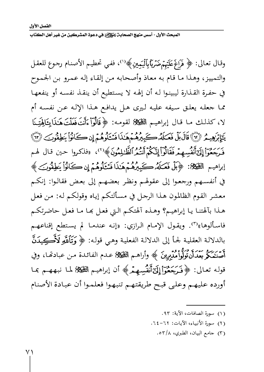 وقال تعالى: {فَرَاغَ عَلَيْهِمْ ضَرْبًا بِالْيَمِينِ} (¬١)، ففي تحطيم الأصنام رجوع للعقل والتمييز، وهذا ما قام به معاذ وأصحابه من إلقاء إله عمرو بن الجموح في حفرة القذارة ليبينوا له أن إلهه لا يستطيع أن ينقذ نفسه أو ينفعها مما جعله يعلق سيفه عليه ليرى هل يدافع هذا الإله عن نفسه أم لا، كذلك ما قال إبراهيم - عليه السلام - لقومه: {قَالُوا أَأَنْتَ فَعَلْتَ هَذَا بِآلِهَتِنَا يَاإِبْرَاهِيمُ (٦٢) قَالَ بَلْ فَعَلَهُ كَبِيرُهُمْ هَذَا فَاسْأَلُوهُمْ إِنْ كَانُوا يَنْطِقُونَ (٦٣) فَرَجَعُوا إِلَى أَنْفُسِهِمْ فَقَالُوا إِنَّكُمْ أَنْتُمُ الظَّالِمُونَ} (¬٢)، "فذكروا حين قال لهم إبراهيم - عليه السلام -: {بَلْ فَعَلَهُ كَبِيرُهُمْ هَذَا فَاسْأَلُوهُمْ إِنْ كَانُوا يَنْطِقُونَ} في أنفسهم ورجعوا إلى عقولهم ونظر بعضهم إلى بعض فقالوا: إنكم معشر القوم الظالمون هذا الرجل في مسألتكم إياه وقولكم له: من فعل هذا بآلهتنا يا إبراهيم؟ وهذه آلهتكم التي فعل بها ما فعل حاضرتكم فاسألوها" (¬٣).