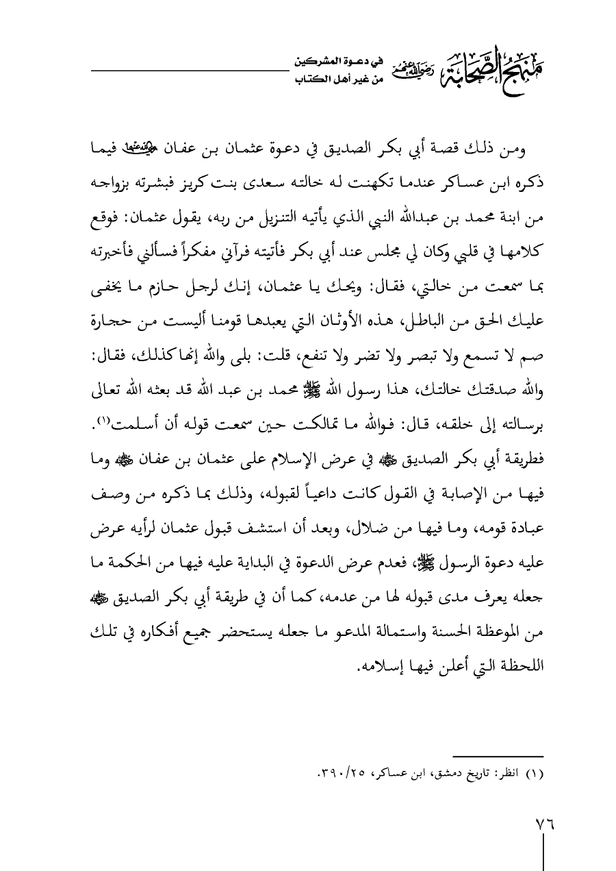 ومن ذلك قصة أبي بكر الصديق في دعوة عثمان بن عفان - رضي الله عنهما - فيما ذكره ابن عساكر عندما تكهنت له خالته سعدى بنت كريز فبشرته بزواجه من ابنة محمد بن عبدالله النبي الذي يأتيه التنزيل من ربه، يقول عثمان: فوقع كلامها في قلبي وكان لي مجلس عند أبي بكر فأتيته فرآني مفكراً فسألني فأخبرته بما سمعت من خالتي، فقال: ويحك يا عثمان، إنك لرجل حازم ما يخفى عليك الحق من الباطل، هذه الأوثان التي يعبدها قومنا أليست من حجارة صم لا تسمع ولا تبصر ولا تضر ولا تنفع، قلت: بلى والله إنها كذلك، فقال: والله صدقتك خالتك، هذا رسول الله - صلى الله عليه وسلم - محمد بن عبد الله قد بعثه الله تعالى برسالته إلى خلقه، قال: فوالله ما تمالكت حين سمعت قوله أن أسلمت (¬١). فطريقة أبي بكر الصديق - رضي الله عنه - في عرض الإسلام على عثمان بن عفان - رضي الله عنه - وما فيها من الإصابة في القول كانت داعياً لقبوله، وذلك بما ذكره من وصف عبادة قومه، وما فيها من ضلال، وبعد أن استشف قبول عثمان لرأيه عرض عليه دعوة الرسول - صلى الله عليه وسلم -، فعدم عرض الدعوة في البداية عليه فيها من الحكمة ما جعله يعرف مدى قبوله لها من عدمه، كما أن في طريقة أبي بكر الصديق - رضي الله عنه - من الموعظة الحسنة واستمالة المدعو ما جعله يستحضر جميع أفكاره في تلك اللحظة التي أعلن فيها إسلامه.