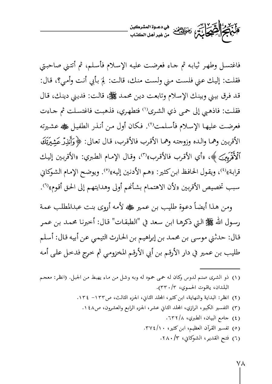 فاغتسل وطهر ثيابه ثم جاء فعرضت عليه الإسلام فأسلم، ثم أتتني صاحبتي فقلت: إليك عني فلست مني ولست منك، قالت: لِمَ بأبي أنت وأمي؟، قال: قد فرق بيني وبينك الإسلام وتابعت دين محمد - صلى الله عليه وسلم -، قالت: فديني دينك، قال فقلت: فاذهبي إلى حمى ذي الشرى (¬١) فتطهري، فذهبت فاغتسلت ثم جاءت فعرضت عليها الإسلام فأسلمت (¬٢). فكان أول من أنذر الطفيل - رضي الله عنه - عشيرته الأقربين وهما والده وزوجته وهما الأقرب فالأقرب، قال تعالى: {وَأَنْذِرْ عَشِيرَتَكَ الْأَقْرَبِينَ}، "أي الأقرب فالأقرب" (¬٣)، وقال الإمام الطبري: "الأقربين إليك قرابة" (¬٤)،