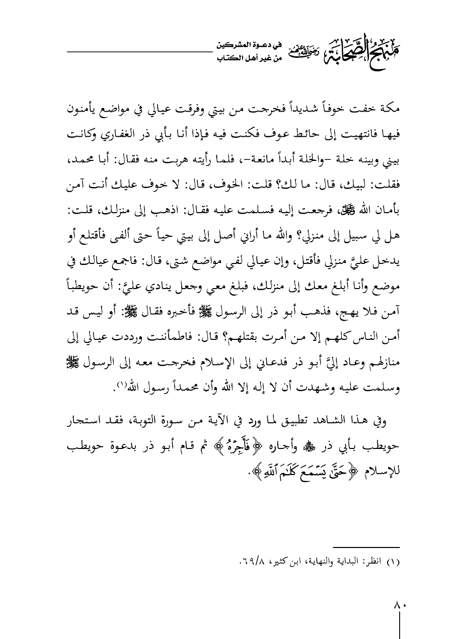 وفي هذا الشاهد تطبيق لما ورد في الآية من سورة التوبة، فقد استجار حويطب بأبي ذر - رضي الله عنهم - وأجاره {فَأَجِرْهُ} ثم قام أبو ذر بدعوة حويطب للإسلام {حَتَّى يَسْمَعَ كَلَامَ اللَّهِ}.