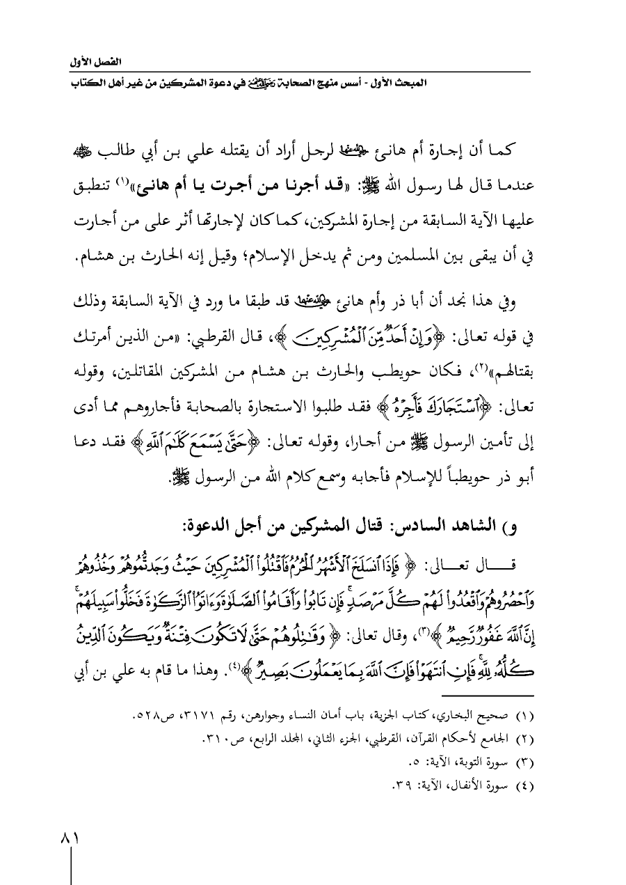 وفي هذا نجد أن أبا ذر وأم هانئ - رضي الله عنهما - قد طبقا ما ورد في الآية السابقة وذلك في قوله تعالى: {وَإِنْ أَحَدٌ مِنَ الْمُشْرِكِينَ}، قال القرطبي: "من الذين أمرتك بقتالهم" (¬٢)، فكان حويطب والحارث بن هشام من المشركين المقاتلين، وقوله تعالى: {اسْتَجَارَكَ فَأَجِرْهُ} فقد طلبوا الاستجارة بالصحابة فأجاروهم مما أدى إلى تأمين الرسول - صلى الله عليه وسلم - من أجارا، وقوله تعالى: {حَتَّى يَسْمَعَ كَلَامَ اللَّهِ} فقد دعا أبو ذر حويطباً للإسلام فأجابه وسمع كلام الله من الرسول - صلى الله عليه وسلم -.