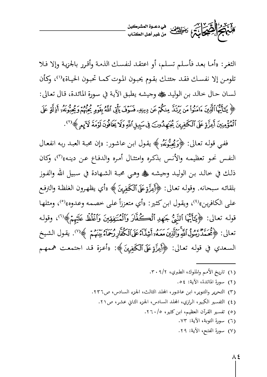 ففي قوله تعالى: {وَيُحِبُّونَهُ} يقول ابن عاشور: "إن محبة العبد ربه انفعال النفس نحو تعظيمه والأنس بذكره وامتثال أمره والدفاع عن دينه" (¬٣)، وكان ذلك في خالد بن الوليد وجيشه - رضي الله عنهم - وهي محبة الشهادة في سبيل الله والفوز بلقائه سبحانه. وقوله تعالى: {أَعِزَّةٍ عَلَى الْكَافِرِينَ} "أي يظهرون الغلظة والترفع على الكافرين" (¬٤)، ويقول ابن كثير: "أي متعززاً على خصمه وعدوه" (¬٥)، ومثلها قوله تعالى: {يَاأَيُّهَا النَّبِيُّ جَاهِدِ الْكُفَّارَ وَالْمُنَافِقِينَ وَاغْلُظْ عَلَيْهِمْ} (¬٦)، وقوله تعالى: {مُحَمَّدٌ رَسُولُ اللَّهِ وَالَّذِينَ مَعَهُ أَشِدَّاءُ عَلَى الْكُفَّارِ رُحَمَاءُ بَيْنَهُمْ} (¬٧). يقول الشيخ السعدي في قوله تعالى: {أَعِزَّةٍ عَلَى الْكَافِرِينَ}: "أعزة قد اجتمعت هممهم