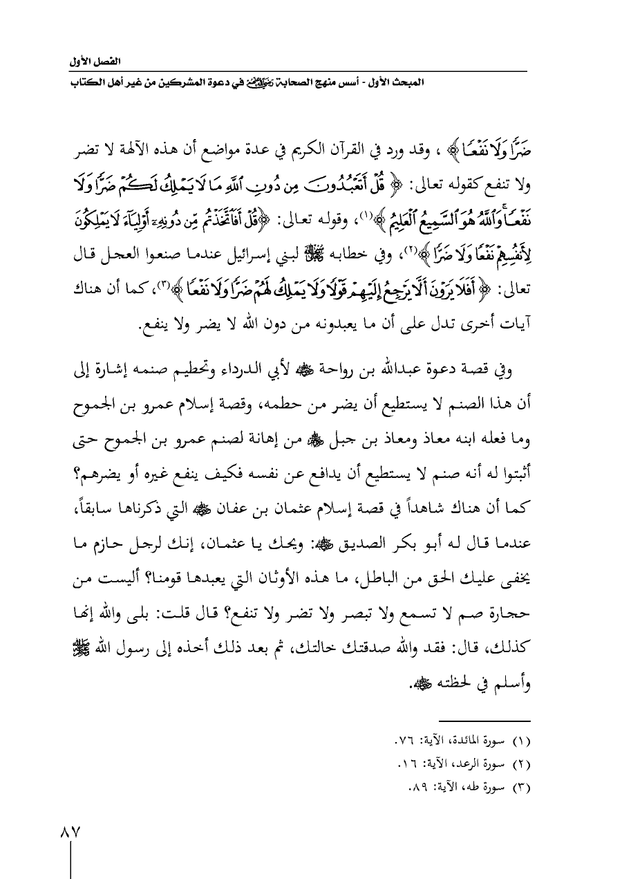 وفي قصة دعوة عبدالله بن رواحة - رضي الله عنه - لأبي الدرداء وتحطيم صنمه إشارة إلى أن هذا الصنم لا يستطيع أن يضر من حطمه، وقصة إسلام عمرو بن الجموح وما فعله ابنه معاذ ومعاذ بن جبل - رضي الله عنهم - من إهانة لصنم عمرو بن الجموح حتى أثبتوا له أنه صنم لا يستطيع أن يدافع عن نفسه فكيف ينفع غيره أو يضرهم؟ كما أن هناك شاهداً في قصة إسلام عثمان بن عفان - رضي الله عنه - التي ذكرناها سابقاً، عندما قال له أبو بكر الصديق - رضي الله عنه -: ويحك يا عثمان، إنك لرجل حازم ما يخفى عليك الحق من الباطل، ما هذه الأوثان التي يعبدها قومنا؟ أليست من حجارة صم لا تسمع ولا تبصر ولا تضر ولا تنفع؟ قال قلت: بلى والله إنها كذلك، قال: فقد والله صدقتك خالتك، ثم بعد ذلك أخذه إلى رسول الله - صلى الله عليه وسلم - وأسلم في لحظته - رضي الله عنه -.