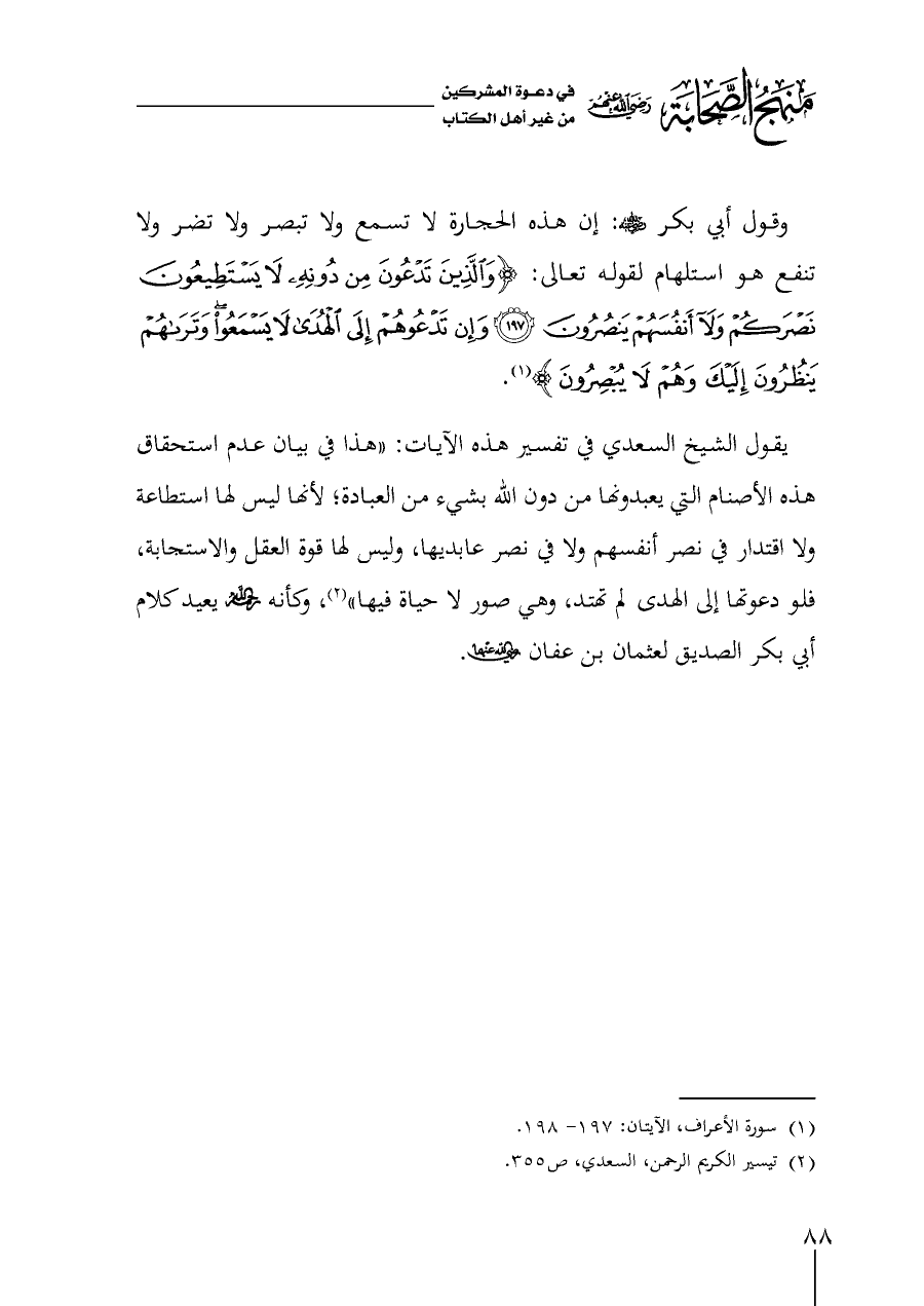 يقول الشيخ السعدي في تفسير هذه الآيات: "هذا في بيان عدم استحقاق هذه الأصنام التي يعبدونها من دون الله بشيء من العبادة؛ لأنها ليس لها استطاعة ولا اقتدار في نصر أنفسهم ولا في نصر عابديها، وليس لها قوة العقل والاستجابة، فلو دعوتها إلى الهدى لم تهتد، وهي صور لا حياة فيها" (¬٢)، وكأنه - رحمه الله - يعيد كلام أبي بكر الصديق لعثمان بن عفان - رضي الله عنهما -.