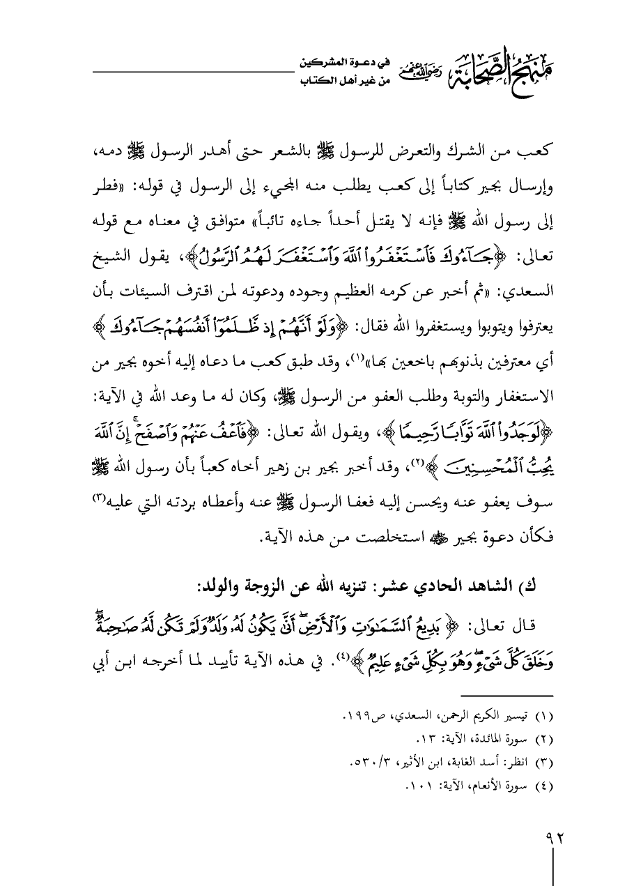 كعب من الشرك والتعرض للرسول - صلى الله عليه وسلم - بالشعر حتى أهدر الرسول - صلى الله عليه وسلم - دمه، وإرسال بجير كتاباً إلى كعب يطلب منه المجيء إلى الرسول في قوله: "فطر إلى رسول الله - صلى الله عليه وسلم - فإنه لا يقتل أحداً جاءه تائباً" متوافق في معناه مع قوله تعالى: {جَاءُوكَ فَاسْتَغْفَرُوا اللَّهَ وَاسْتَغْفَرَ لَهُمُ الرَّسُولُ}، يقول الشيخ السعدي: "ثم أخبر عن كرمه العظيم وجوده ودعوته لمن اقترف السيئات بأن يعترفوا ويتوبوا ويستغفروا الله فقال: {وَلَوْ أَنَّهُمْ إِذْ ظَلَمُوا أَنْفُسَهُمْ جَاءُوكَ} أي معترفين بذنوبهم باخعين بها" (¬١)، وقد طبق كعب ما دعاه إليه أخوه بجير من الاستغفار والتوبة وطلب العفو من الرسول - صلى الله عليه وسلم -، وكان له ما وعد الله في الآية: {لَوَجَدُوا اللَّهَ تَوَّابًا رَحِيمًا}، ويقول الله تعالى: {فَاعْفُ عَنْهُمْ وَاصْفَحْ إِنَّ اللَّهَ يُحِبُّ الْمُحْسِنِينَ} (¬٢)، وقد أخبر بجير بن زهير أخاه كعباً بأن رسول الله - صلى الله عليه وسلم - سوف يعفو عنه ويحسن إليه فعفا الرسول - صلى الله عليه وسلم - عنه وأعطاه بردته التي عليه (¬٣) فكأن دعوة بجير - رضي الله عنه - استخلصت من هذه الآية.