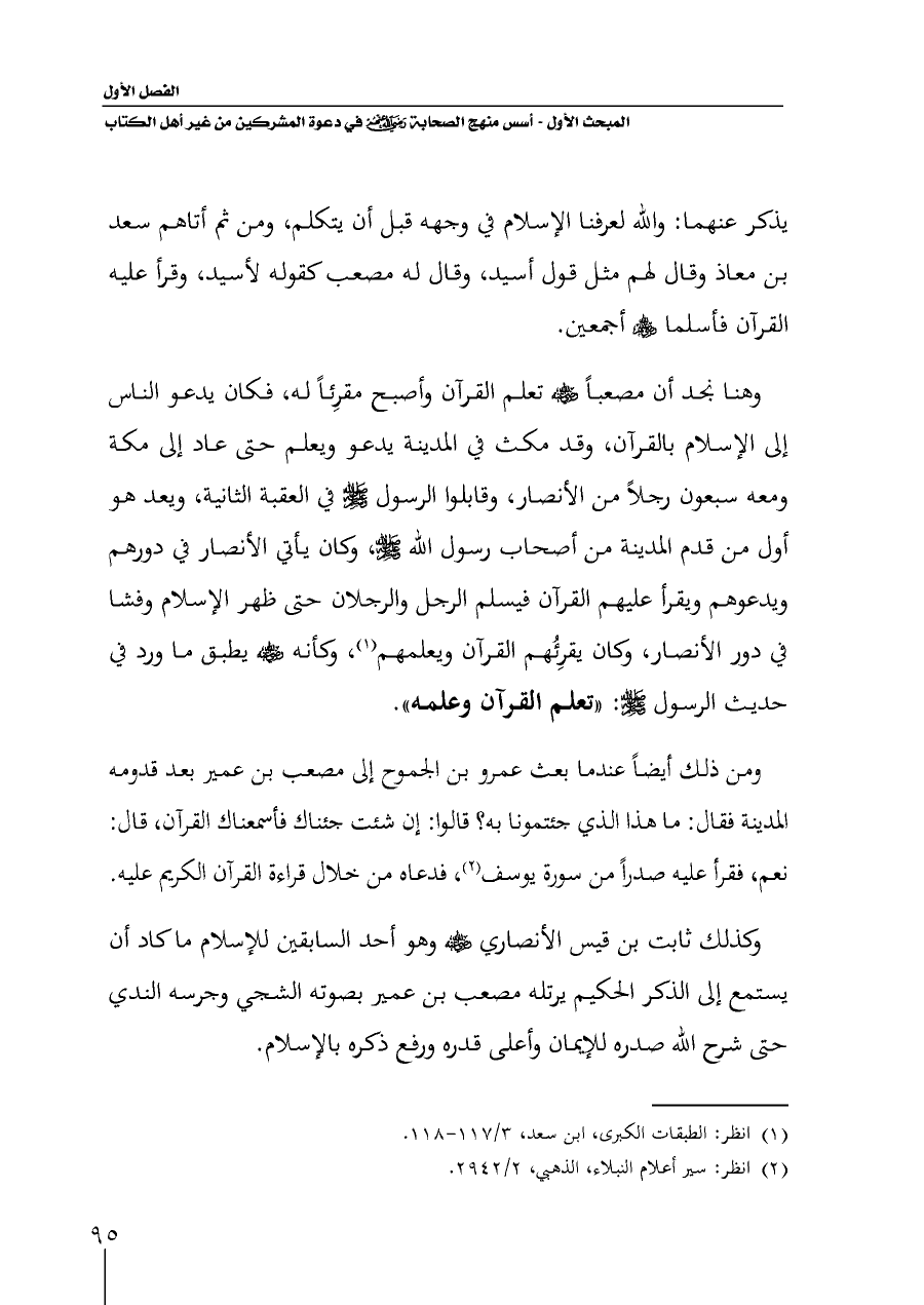 وهنا نجد أن مصعباً - رضي الله عنه - تعلم القرآن وأصبح مقرِئاً له، فكان يدعو الناس إلى الإسلام بالقرآن، وقد مكث في المدينة يدعو ويعلم حتى عاد إلى مكة ومعه سبعون رجلاً من الأنصار، وقابلوا الرسول - صلى الله عليه وسلم - في العقبة الثانية، ويعد هو أول من قدم المدينة من أصحاب رسول الله - صلى الله عليه وسلم -، وكان يأتي الأنصار في دورهم ويدعوهم ويقرأ عليهم القرآن فيسلم الرجل والرجلان حتى ظهر الإسلام وفشا في دور الأنصار، وكان يقرِئُهم القرآن ويعلمهم (¬١)، وكأنه - رضي الله عنه - يطبق ما ورد في حديث الرسول - صلى الله عليه وسلم -: (تعلم القرآن وعلمه (.
