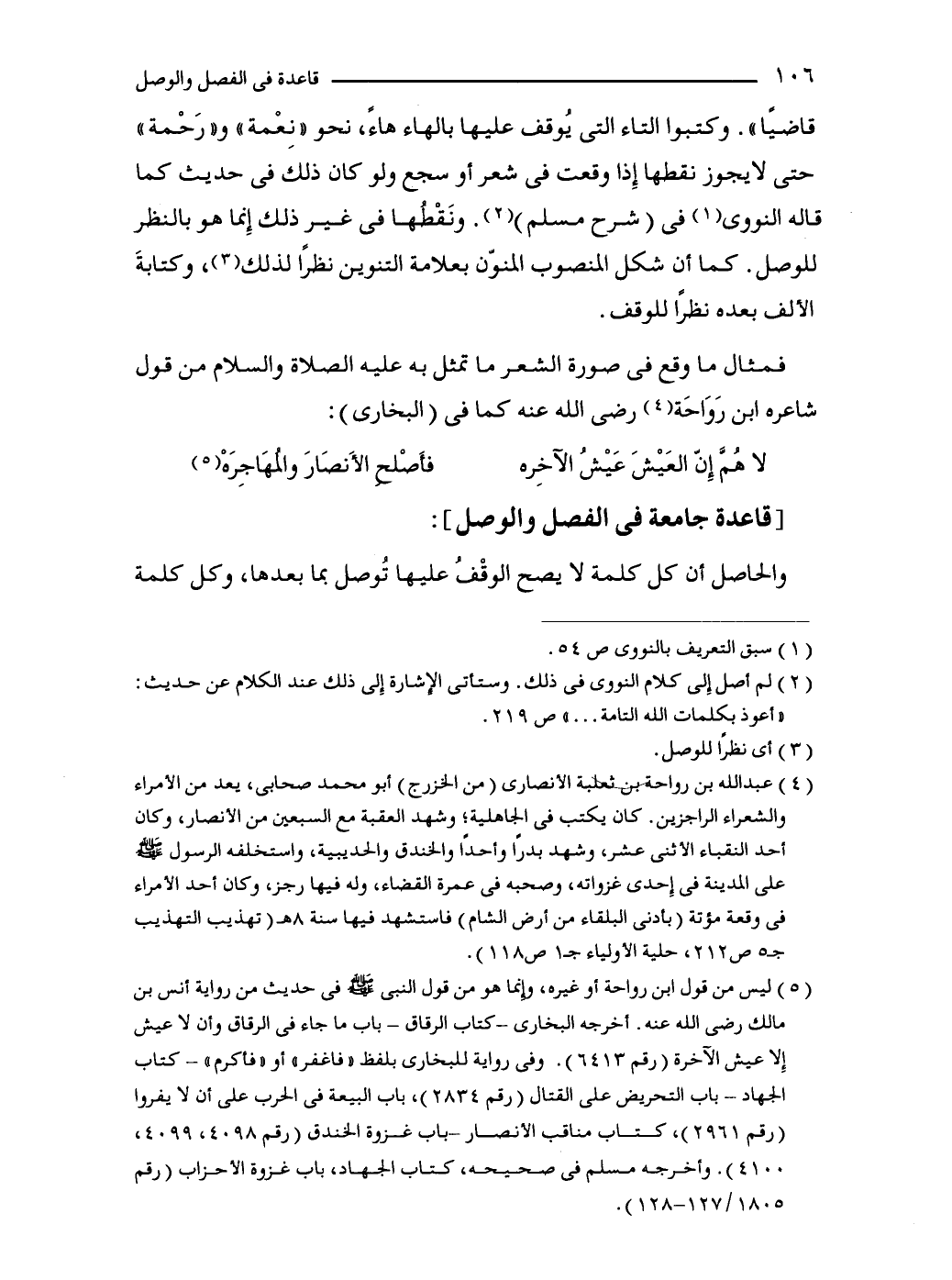 قاضيًا". وكتبوا التاء التي يُوقف عليها بالهاء هاءً، نحو "نِعْمة" و"رَحْمة" حتى لا يجوز نقطها إِذا وقعت في شعر أو سجع ولو كان ذلك في حديث كما قاله النووى (1) في (شرح مسلم) (2). ونَقْطُها في غير ذلك إِنما هو بالنظر للوصل. كما أن شكل المنصوب المنوّن بعلامة التنوين نظرًا لذلك (3)، وكتابةَ الألف بعده نظرًا للوقف.