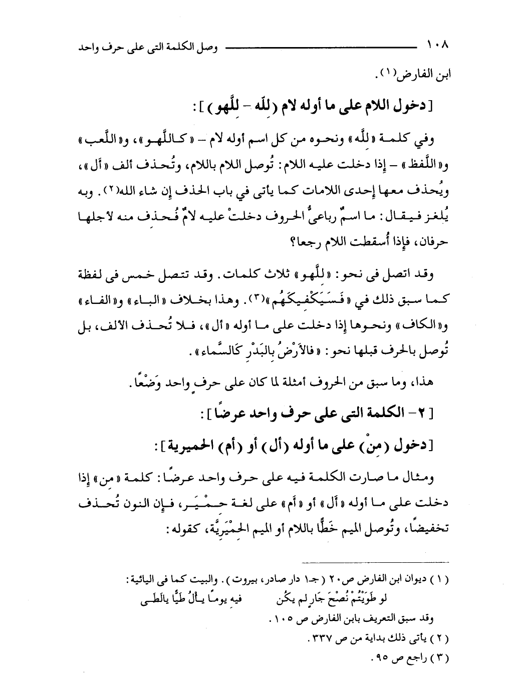 ومثال ما صارت الكلمة فيه على حرف واحد عرضًا: كلمة "مِن" إِذا دخلت على ما أوله "أَل" أو "أَم" على لغة حِمْيَر، فإِن النون تُحذف تخفيضًا، وتُوصل الميم خَطًّا باللام أو الميم الحِمْيَرِيَّة، كقوله: