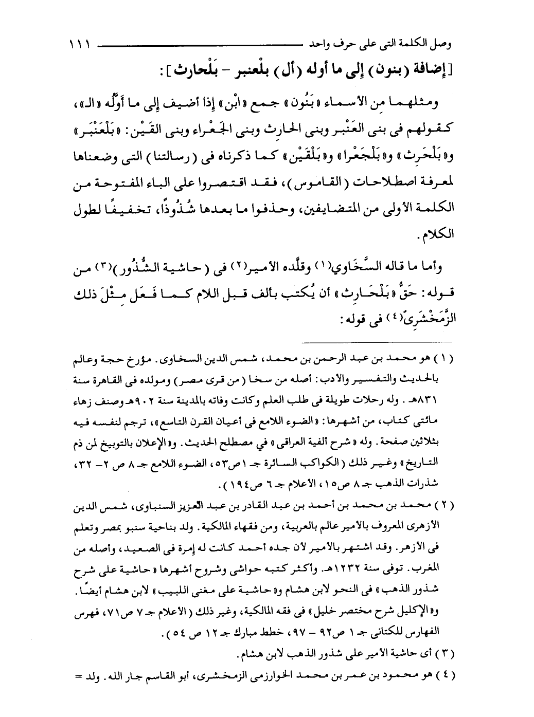 وأما ما قاله السَّخَاوى (1) وقلَّده الأمير (2) في (حاشية الشُّذُور) (3) من قوله: حَقُّ "بَلْحَارِث" أن يُكتب بألف قبل اللام كما فَعَل مِثْلَ ذلك الزَّمَخْشَرِىّ (4) في قوله: