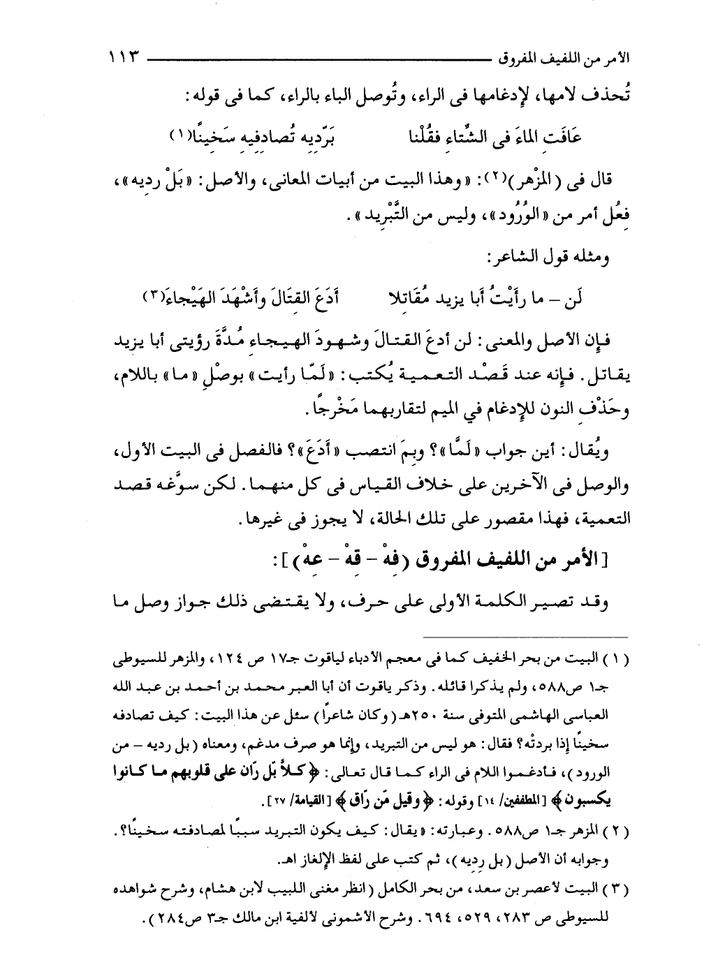 (1) البيت من بحر الخفيف كما في معجم الأدباء لياقوت جـ17 ص 124، والمزهر للسيوطى جـ1 ص 588، ولم يذكرا قائله. وذكر ياقوت أن أبا العبر محمَّد بن أحمد بن عبد الله العباسى الهاشمى المتوفى سنة 250 هـ (وكان شاعرًا) سئل عن هذا البيت: كيف تصادفه سخينًا إِذا بردتْه؟ فقال: هو ليس من التبريد، وإنما هو صرف مدغم، ومعناه (بل رديه- من الورود)، فأدغموا اللام في الراء كما قال تعالى: {كَلَّا بَلْ رَانَ عَلَى قُلُوبِهِمْ مَا كَانُوا يَكْسِبُونَ} [المطففين: 14] وقوله: {وَقِيلَ مَنْ رَاقٍ} [القيامة: 27].