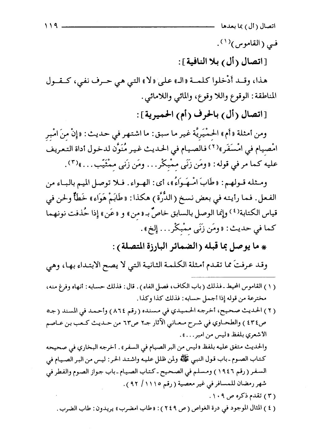 ومن أمثلة "أَم" الحِمْيَرِيَّة غير ما سبق: ما اشتهر في حديث: "إِنْ مِنَ امْبِرِ امْصِيام في امْسَفَر" (2) فالصيام في الحديث غير مُنَوَّن لدخول أداة التعريف عليه كما مر في قوله: "ومَن زَنَى مِمْبِكْر ... ومَن زَنى مِمْثَيّب ... " (3).
