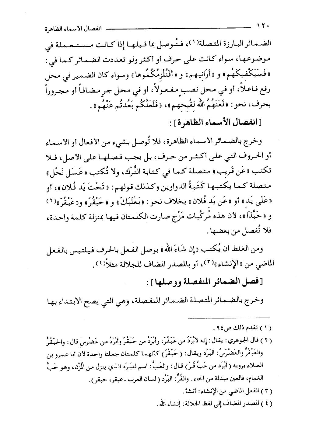 وخرج بالضمائر الأسماء الظاهرة، فلا تُوصل بشيء من الأفعال أو الأسماء أو الحروف التي على أكثر من حرف، بل يجب فصلها على الأصل، فلا تكتب "عَن قَريب" متصلة كما في كتابة التُّرْك، ولا تُكتب "عَسَل نَحْل" متصلة كما يكتبها كَتَبةُ الدواوين وكذلك قولهم: "تَحْتَ يَد فُلان"، أو "عَلَى يَدِ" أو "عَن يَدِ فُلان" بخلاف نحو: "بَعْلَبَكّ" و"حَبْقُرّ" و "عَبْقُرّ" (2) و "حَبَّذَا"، لأن هذه مُركَّبات مَزْج صارت الكلمتان فيها بمنزلة كلمة واحدة، فلا تُفصل من بعضها.