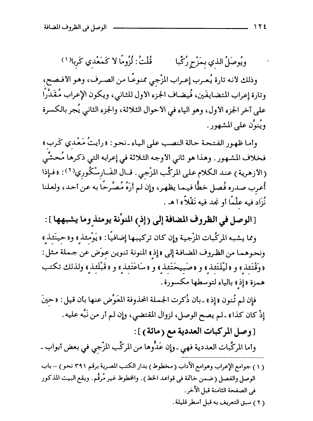 وأما ظهور الفتحة حالة النصب على الياء -نحو: "رأيتُ مَعْدِي كَربِ" فخلاف المشهور. وهذا هو ثاني الأوجه الثلاثة في إِعرابه التي ذكرها مُحشِّي (الأزهرية) عند الكلام على المركَّب المزْجِي. قال الفَارِسْكورِي (2): "فإِذا أُعرِب صدره فُصل خطًّا فيما يظهر، وإن لم أَرَهُ مُصَّرحًا به عن أحد، ولعلنا نُزَاد فيه عِلْمًا أو نجد فيه نَقْلًا" اهـ.