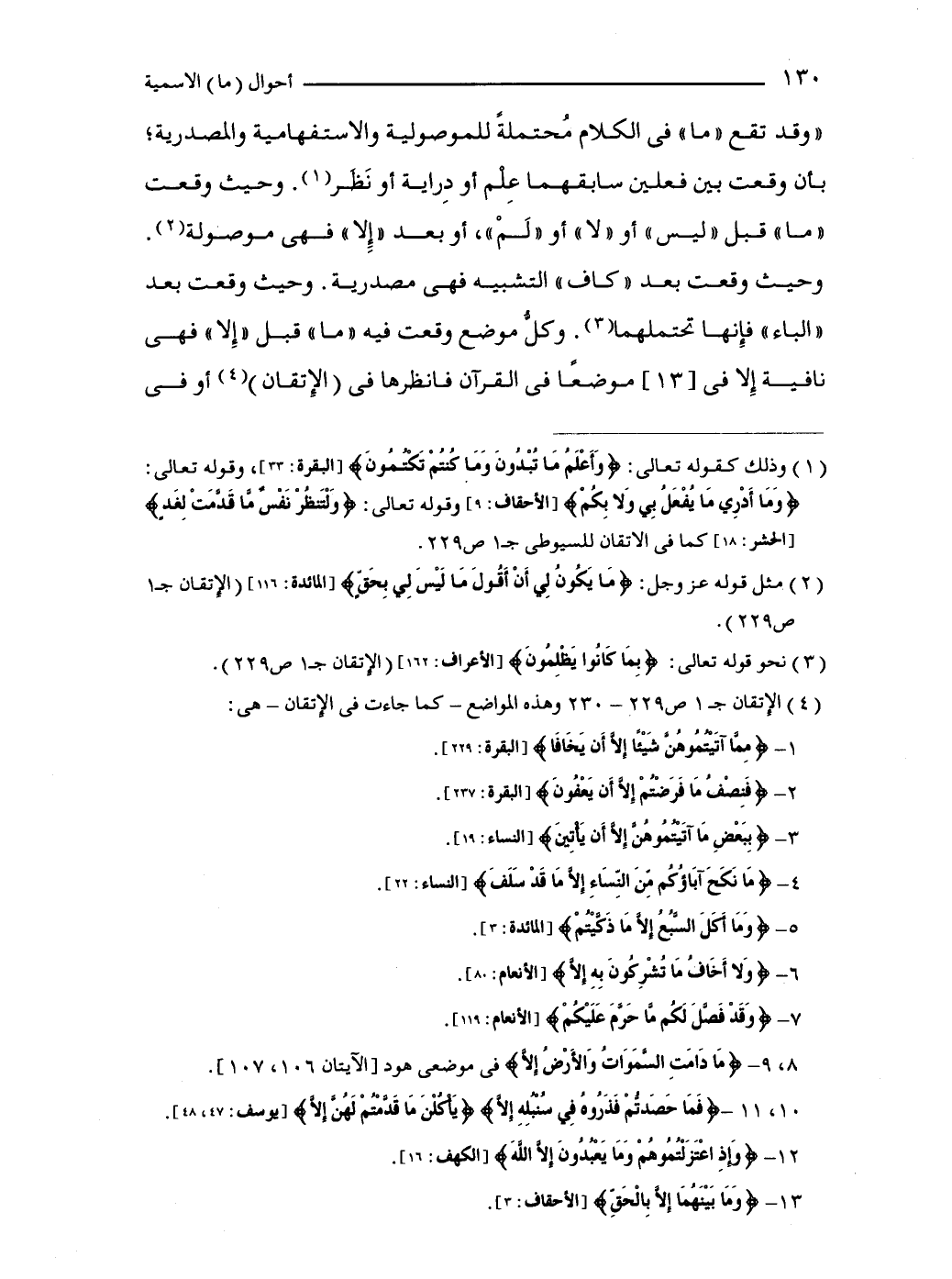 "وقد تقع "ما" في الكلام مُحتملةً للموصولية والاستفهامية والمصدرية؛ بأن وقعت بين فعلين سابقهما عِلْم أو دِراية أو نَظَر (1). وحيث وقعت "ما" قبل "ليس" أو "لا" أو "لَمْ"، أو بعد "إلا" فهي موصولة (2).
