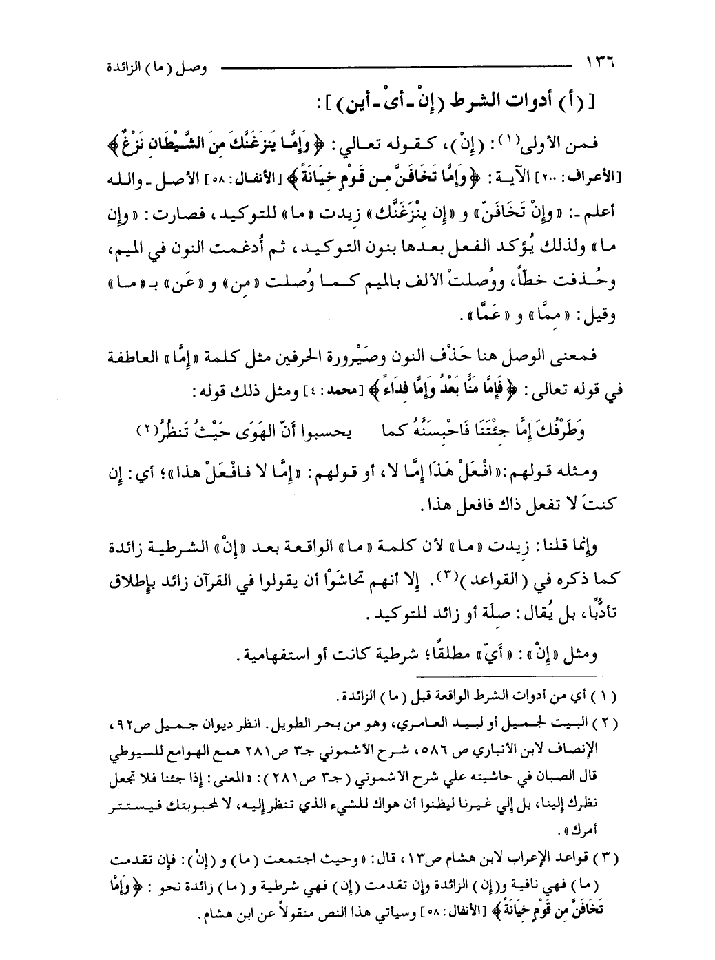 وإنما قلنا: زِيدت "ما" لأن كلمة "ما" الواقعة بعد "إِنْ" الشرطية زائدة كما ذكره في (القواعد) (3). إِلا أنهم تحاشَوْا أن يقولوا في القرآن زائد بإِطلاق تأدُّبًا، بل يُقال: صِلَة أو زائد للتوكيد.