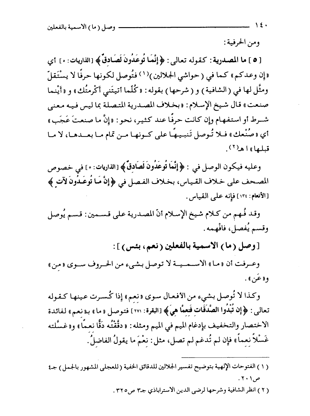 [5] ما المصدرية: كقوله تعالى: {إِنَّمَا تُوعَدُونَ لَصَادِقٌ} [الذاريات: 5] أي "إِن وعدكم" كما في (حواشي الجلالين) (1) فتُوصل لكونها حرفًا لا يسْتَقلّ ومثَّل لها في (الشافية) و (شرحها) بقوله: "كُلّما أتيتَني أَكْرمتُك" و"أَيْنما صنعت" قال شيخ الإِسلام: "بخلاف المصدرية المتصلة بما ليس فيه معنى شرط أو استفهام وإن كانت حرفًا عند كثير، نحو: "إِنَّ ما صنعتَ عَجَب" أي "صُنْعك" فلا تُوصل تَنبيهًا على كونها من تمام ما بعدها, لا ما قبلها" اهـ (2).