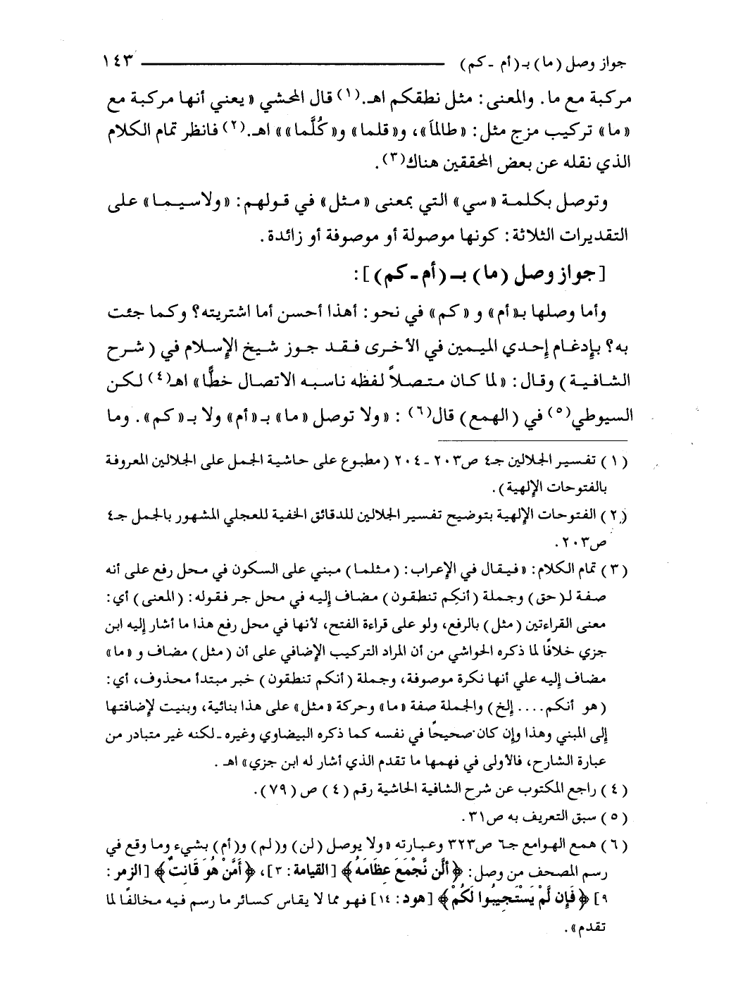 وأما وصلها بـ "أم" و"كم" في نحو: أهذا أحسن أما اشتريته؟ وكما جئت به؟ بإِدغام إِحدي الميمين في الأخرى فقد جوز شيخ الإِسلام في (شرح الشافية) وقال: "لما كان متصلًا لفظه ناسبه الاتصال خطًّا" اهـ (4) لكن السيوطي (5) في (الهمع) قال (6): "ولا توصل "ما" بـ"أم" ولا بـ "كم". وما