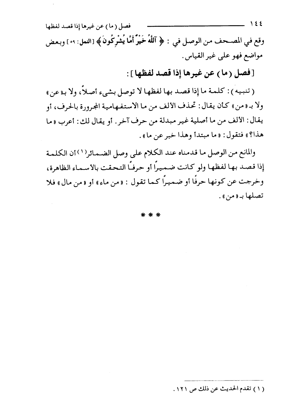 (تنبيه): كلمة ما إِذا قصد بها لفظها لا توصل بشىء أصلًا، ولا بـ "عن" ولا بـ "من" كأن يقال: تحذف الألف من ما الاستفهامية المجرورة بالحرف، أو يقال: الألف من ما أصلية غير مبدلة من حرف آخر. أو يقال لك: أعرب "ما هذا؟ " فتقول: "ما مبتدأ وهذا خبر عن ما".