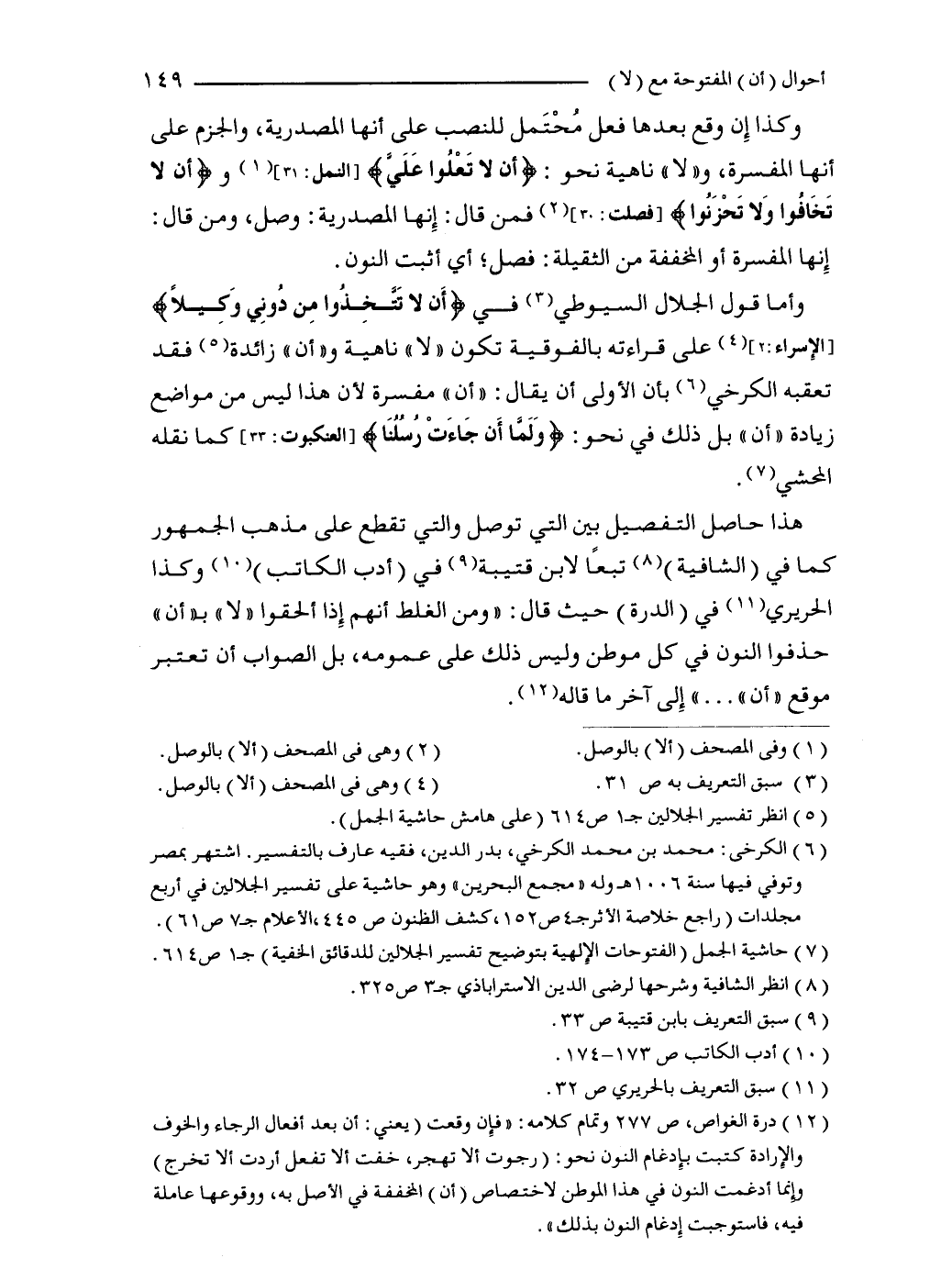 (12) درة الغواص، ص 277 وتمام كلامه: "فإِن وقعت (يعني: أن بعد أفعال الرَّجاء والخوف والإِرادة كتبت بإِدغام النون نحو: (رجوت ألا تهجر، خفت ألا تفعل أردت ألا تخرج) وإنما أدغمت النون في هذا الموطن لاختصاص (أن) المخففة في الأصل به، ووقوعها عاملة فيه، فاستوجبت إِدغام النون بذلك".
