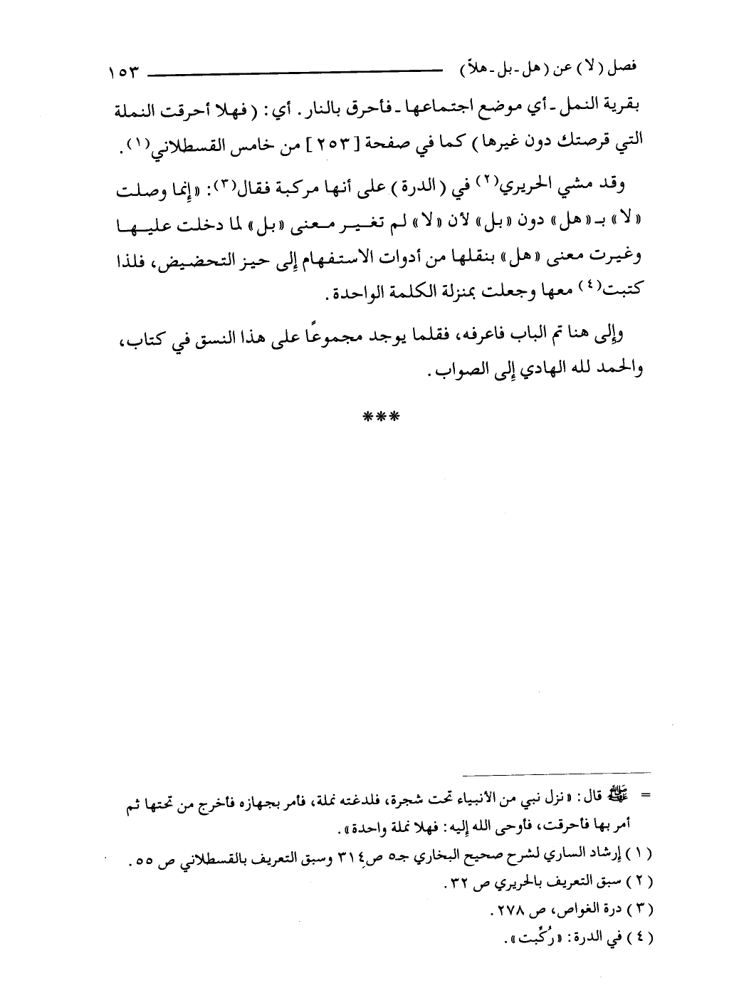 بقرية النمل -أي موضع اجتماعها- فأحرق بالنار. أي: (فهلا أحرقت النملة التي قرصتك دون غيرها) كما في صفحة [253] من خامس القسطلاني (1).
