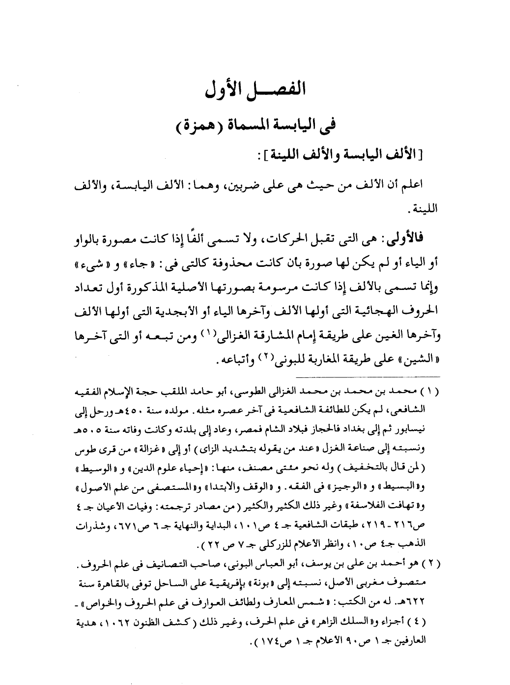 قالأولى: هى التي تقبل الحركات، ولا تسمى ألفًا إِذا كانت مصورة بالواو أو الياء أو لم يكن لها صورة بأن كانت محذوفة كالتى في: "جاء" و"شىء" وإنما تسمى بالألف إِذا كانت مرسومة بصورتها الأصلية المذكورة أول تعداد الحروف الهجائية التي أولها الألف وآخرها الياء أو الأبجدية التي أولها الألف وآخرها الغين على طريقة إِمام المشارقة الغزالي (1) ومن تبعه أو التي آخرها "الشين" على طريقة المغاربة للبونى (2) وأتباعه.
