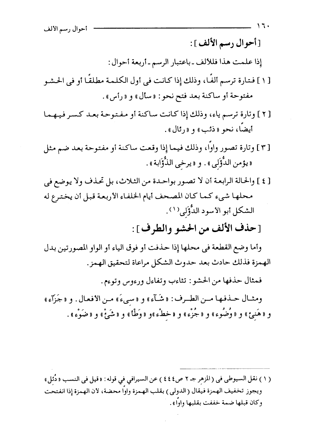 (1) نقل السيوطي في (المزهِر جـ2 ص 444) عن السيرافي في قوله: "قيل في النسب "دُئِل" ويجوز تخفيف الهمزة فيقال (الدولى) بقلب الهمزة واوًا محضة؛ لأن الهمزة إِذا انفتحت وكان قبلها ضمة خففت بقلبها واوًا".