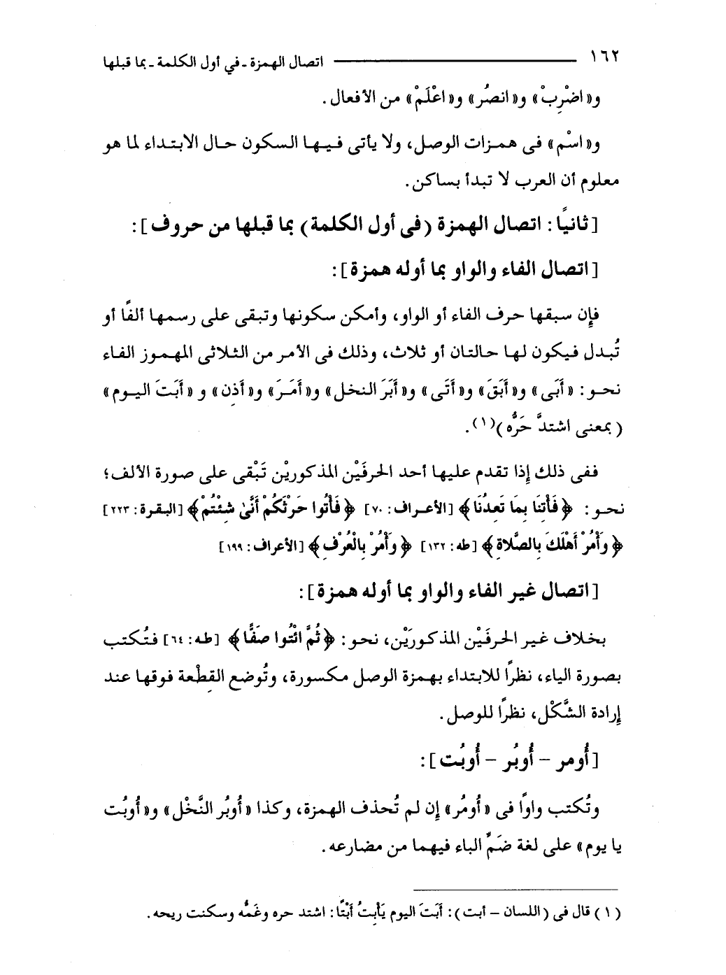 وتُكتب واوًا في "أُومُر" إِن لم تُحذف الهمزة، وكذا "أُوبُر النَّخْل" و"أُوبُت يا يوم" على لغة ضَمِّ الباء فيهما من مضارعه.
