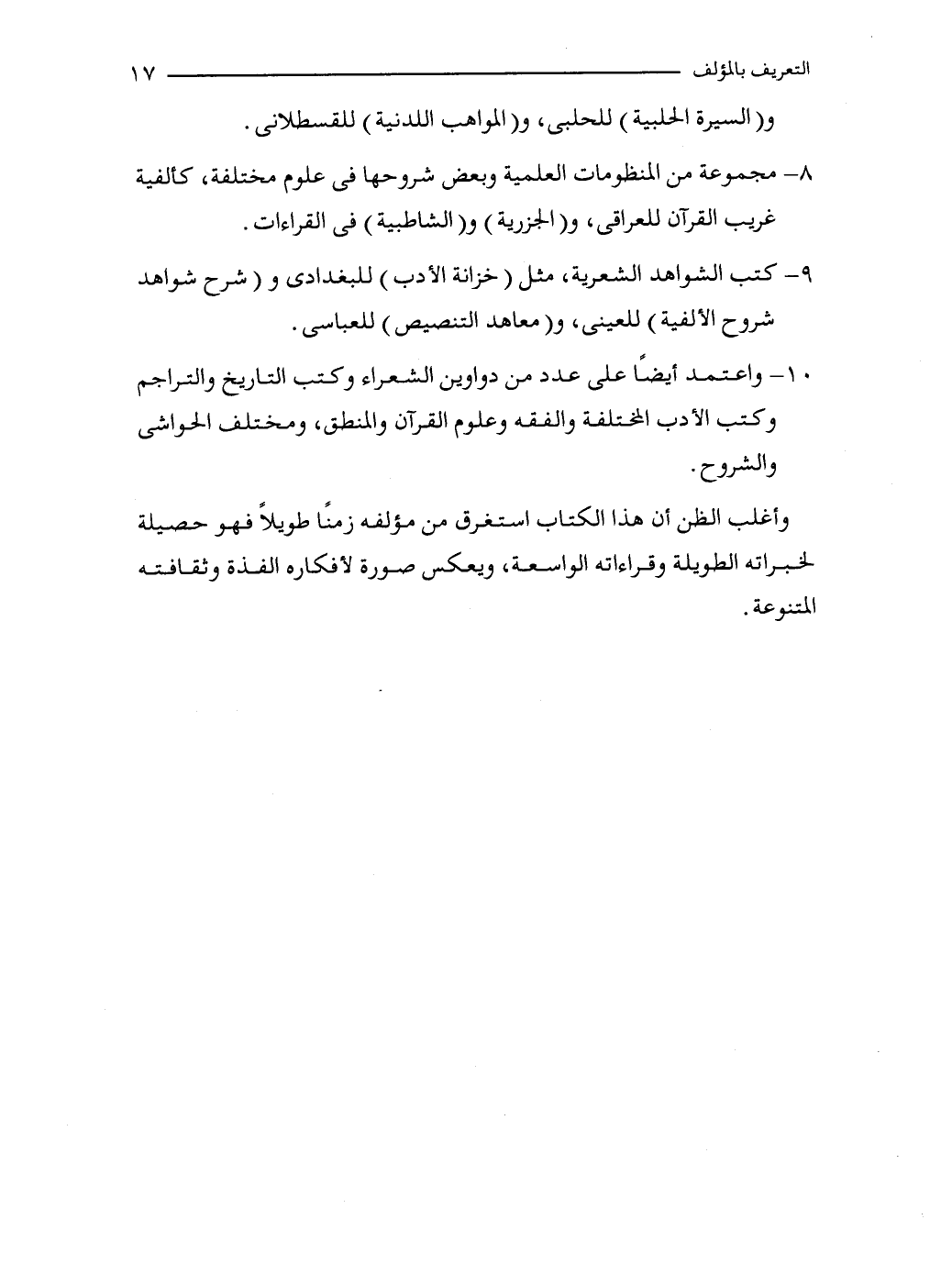 10 - واعتمد أيضًا على عدد من دواوين الشعراء وكتب التاريخ والتراجم وكتب الأدب المختلفة والفقه وعلوم القرآن والمنطق، ومختلف الحواشى والشروح.
