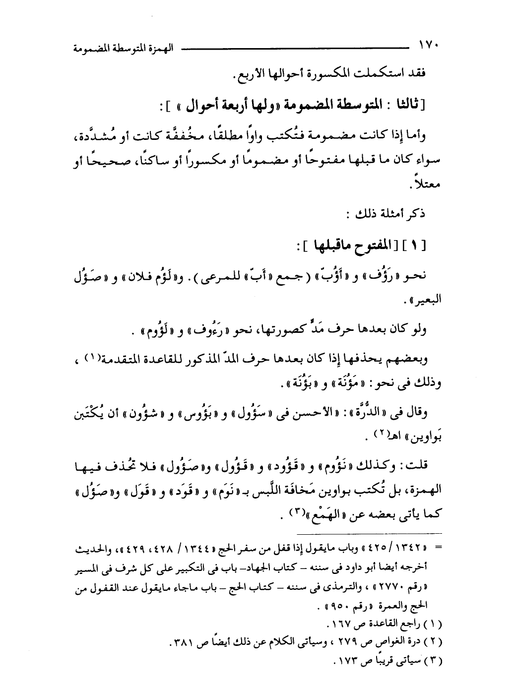 قلت: وكذلك "نَؤُوم" و"قَؤُود" و"قَؤُول" و"صَؤول" فلا تحُذف فيها الهمزة، بل تُكتب بواوين مَخافَة اللَّبس بـ "نَوَم" و"قَوَد" و"قَوَل" و"صَؤُل" كما يأتى بعضه عن "الهَمْع" (3).